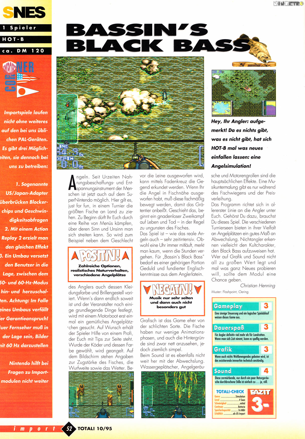 Auch wenn Hot-B normalerweise nicht unbedingt für Spitzenspiele steht, Bassin's Black Bass ist mit Abstand mein Lieblings-Angelspiel auf dem SNES. Das Spielgefühl ist total entspannt, die Grafik liebevoll gemacht und übersichtlich und die Sounds kommen auch sehr realistisch. Schade, dass es keine PAL-Version gibt.