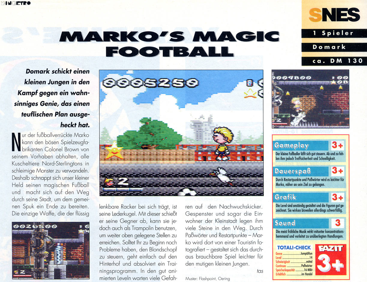 Willkommen in der Welt von Marko, einer Welt des absoluten Cartoon-Wahnsinns. Steig ein in diese irre Mischung aus Fußballtricks und Plattform-Action, die dir Spielspaß der Spitzenklasse bietet. Dazu kommen noch die unglaublichen Grafik-Effekte, die es je gab. Und alles zusammen ergibt - "Marko's Magic Football", den Live-Cartoon zum Spielen.