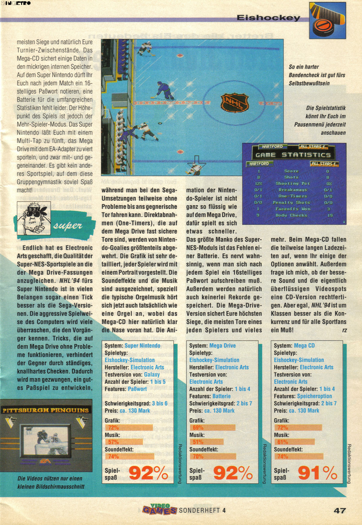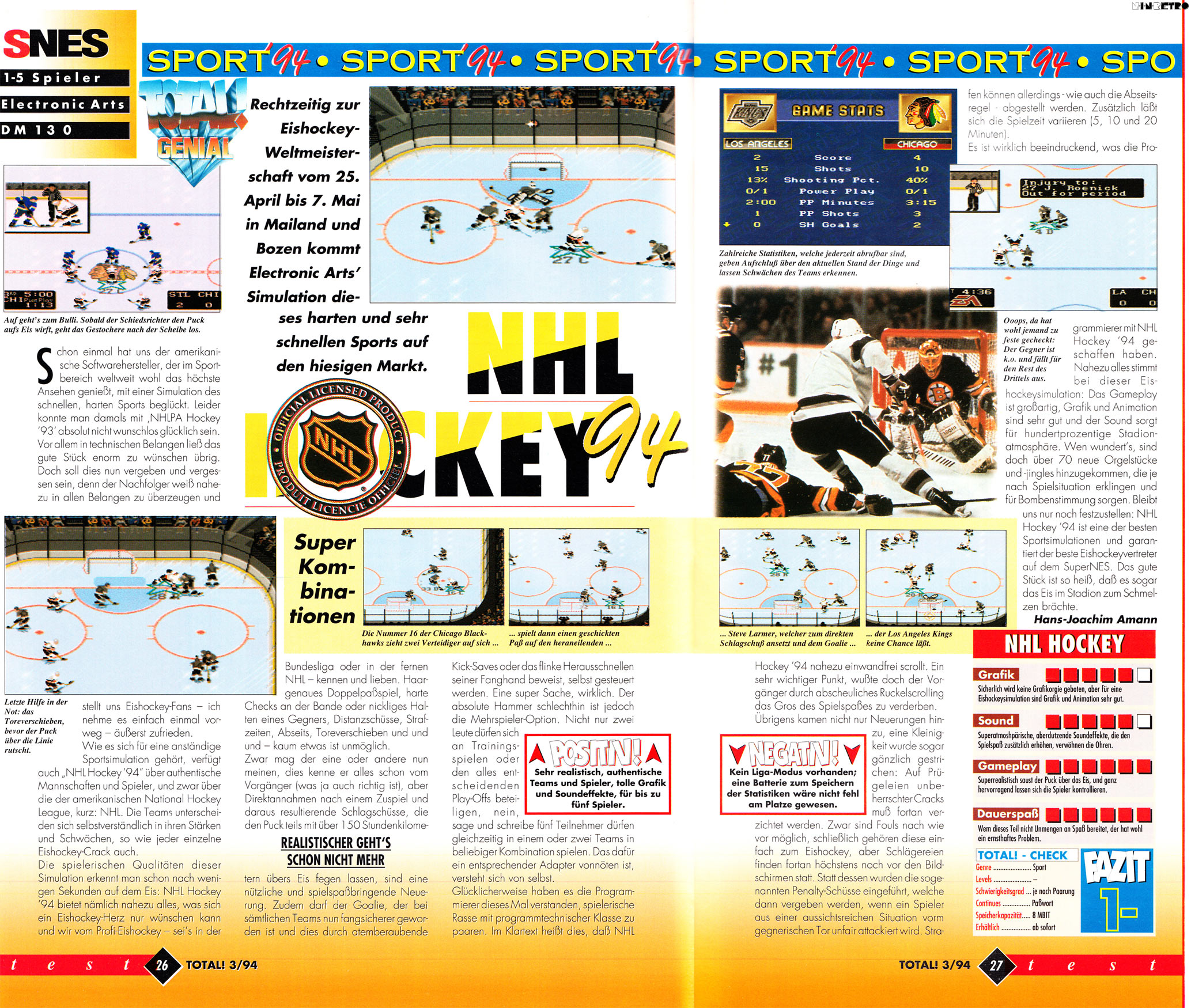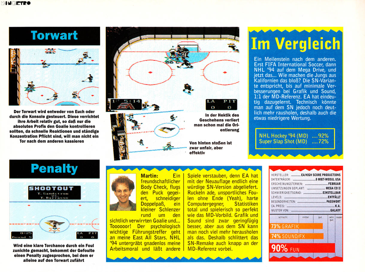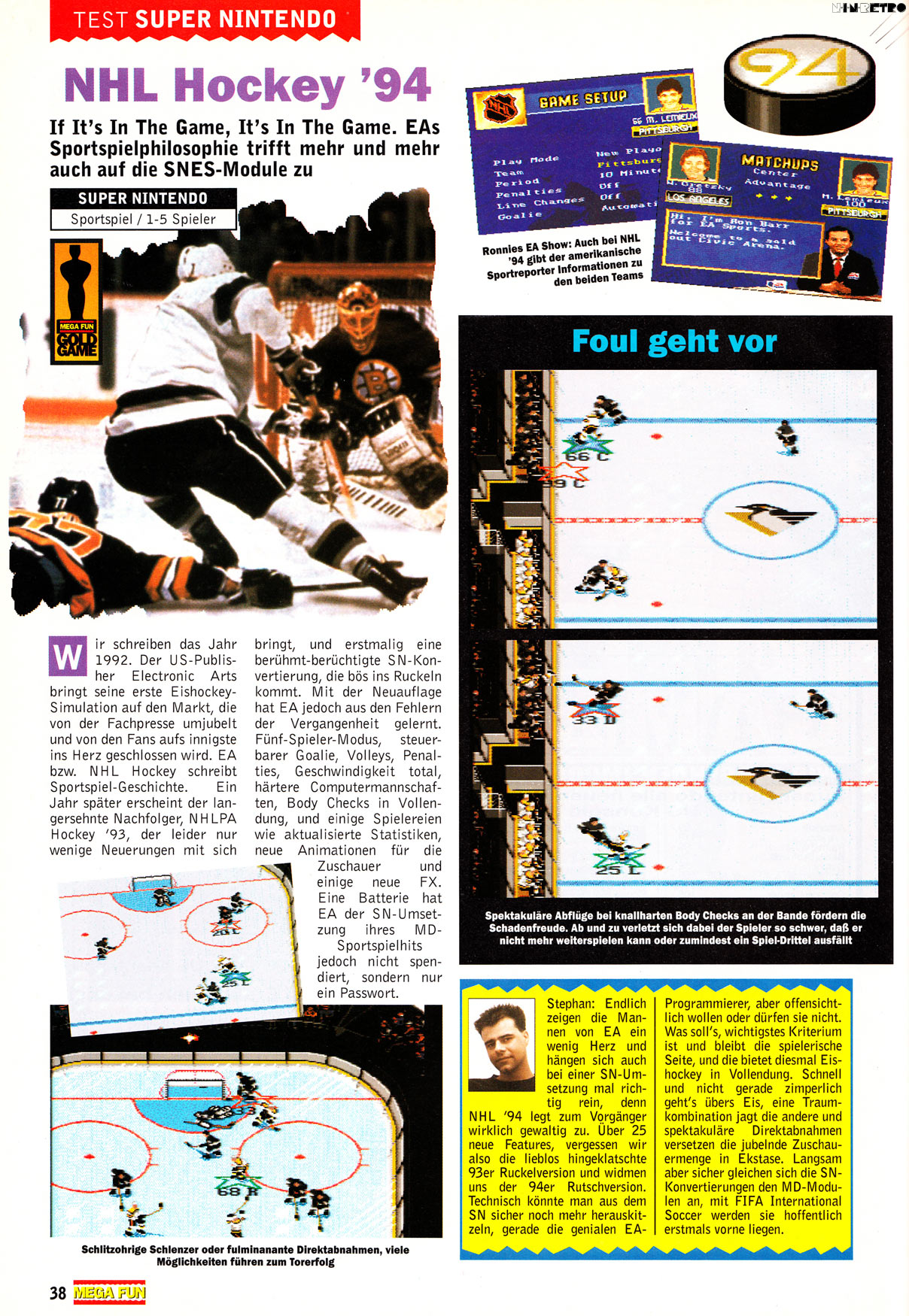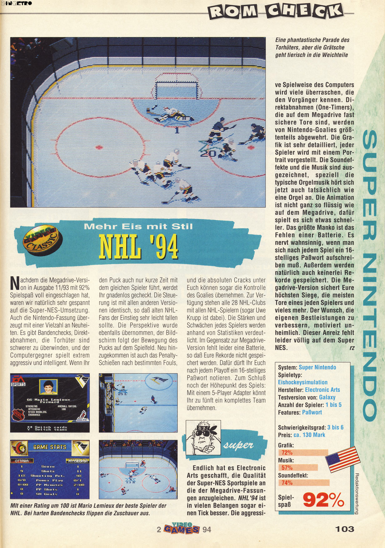Das einzige Problem bei meinem SNES-Modul ist, dass es bei Multitap-Schlachten (3 bis 5 Spieler) öfters mal abstürzt. Trotzdem habe ich seit NHL Hockey '94 nie mehr Konsolen-Hockeyspieler so intuitiv steuern können. In der Fachpresse hochgelobte Titel wie NHL Breakaway (PS oder N64) oder NHL Faceoff (PS) oder auch NHL 2K (Dreamcast) und die ganzen EA-Fortsetzungen haben mir nie mehr denselben Spass beschert, den ich mit NHL Hockey '94 hatte.