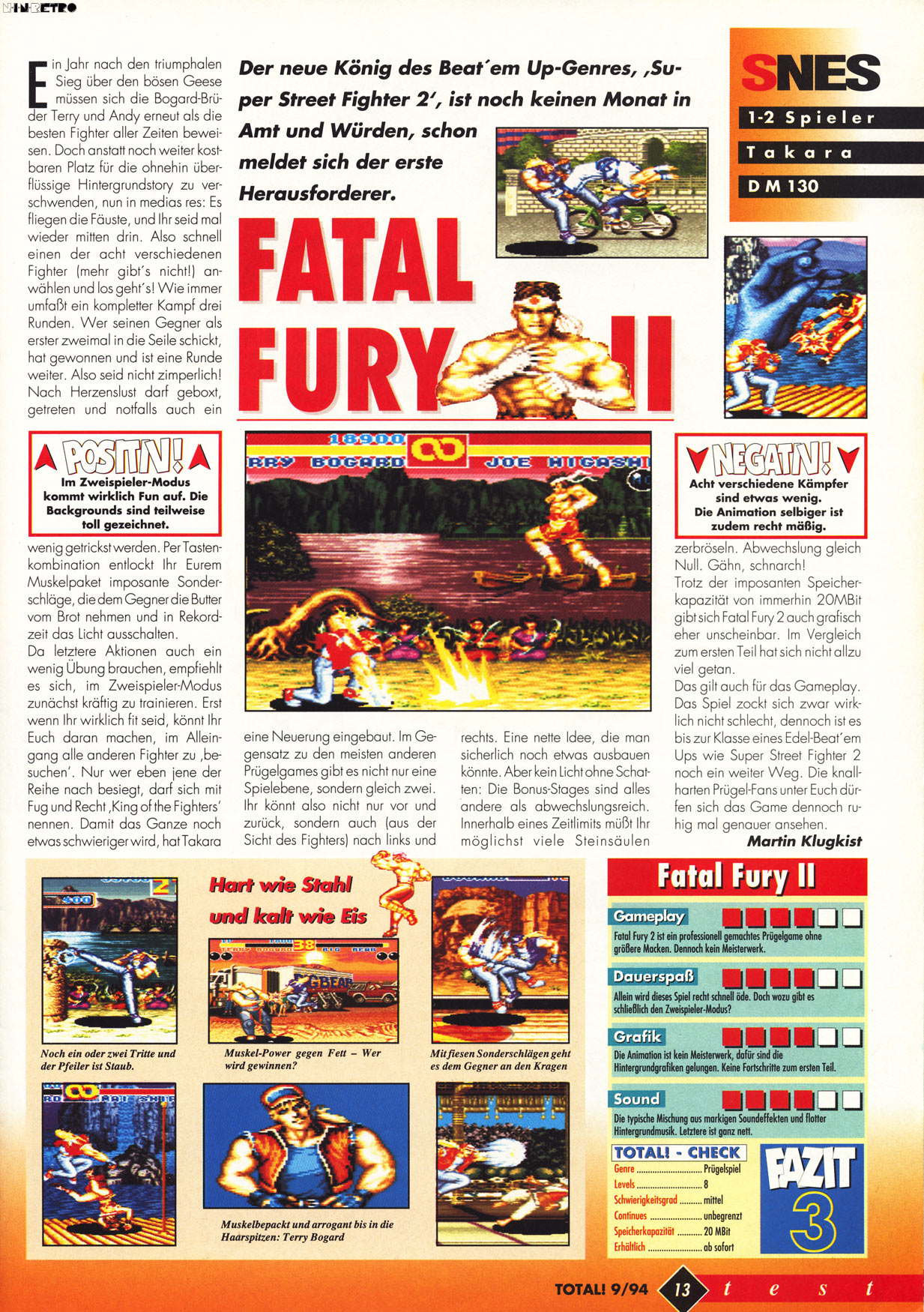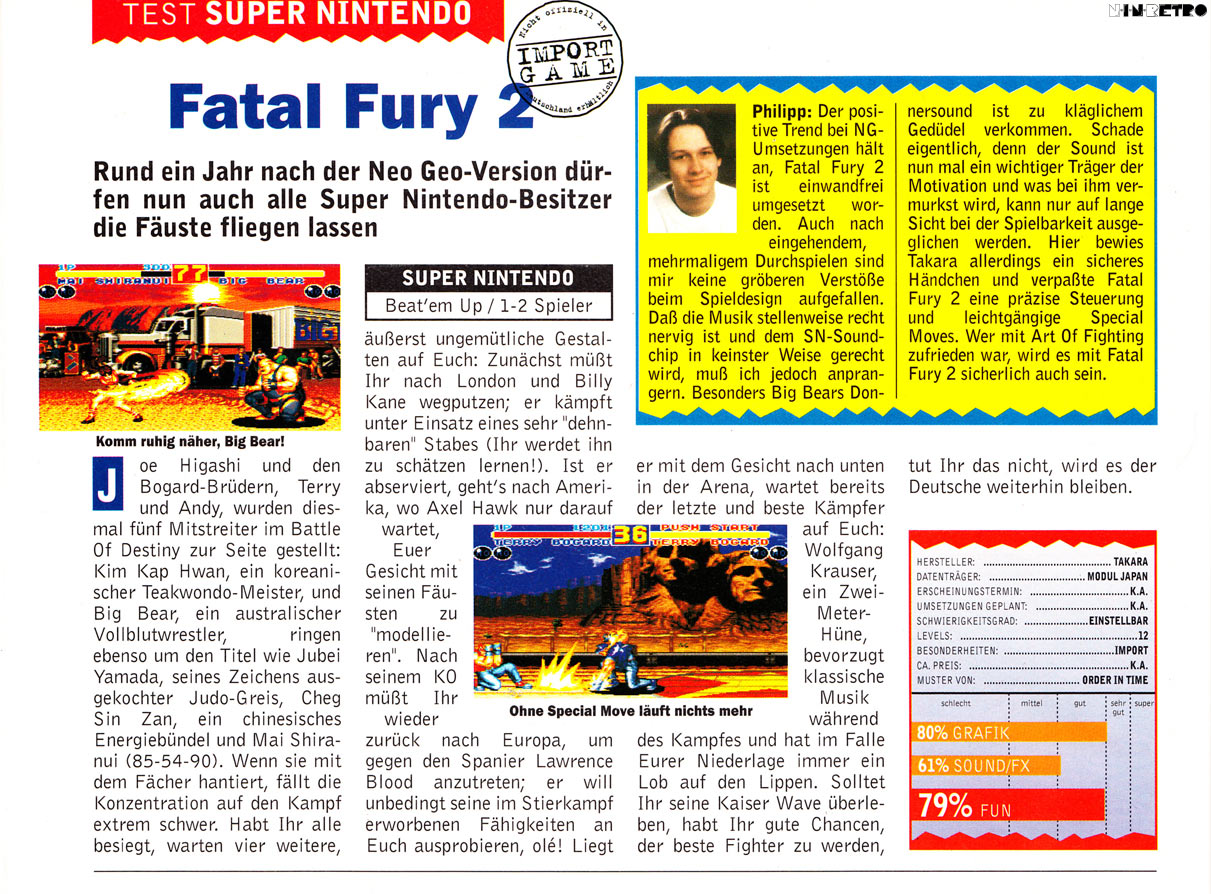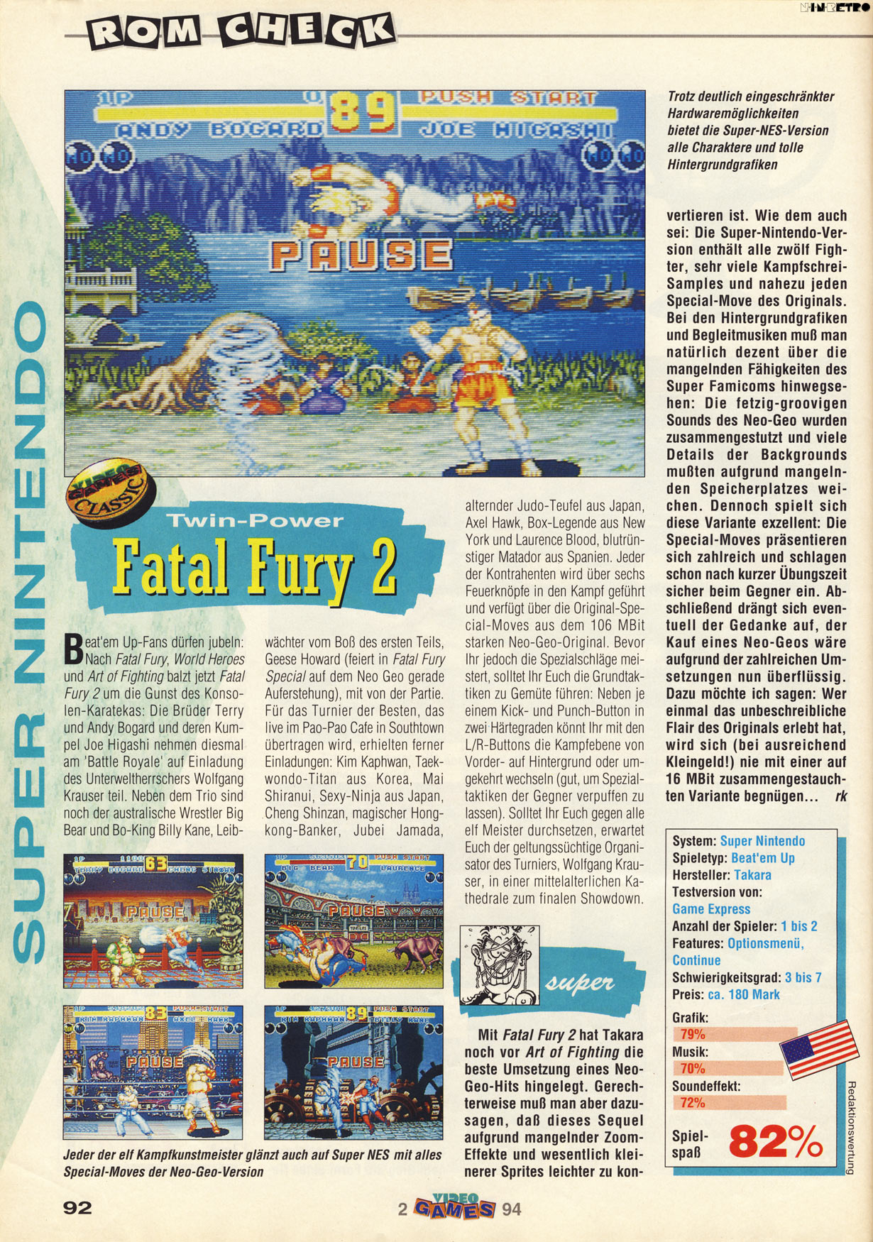 It's time for 20 megs of non-stop action, with another super-hot arcade game for your Super Nintendo. Rejoin the brothers Andy and Terry Bogard, with their friend Joe Higashi as they discover that FATAL FURY was just a warm up! Now they must face the meanest, most dangerous fighters ever assembled!