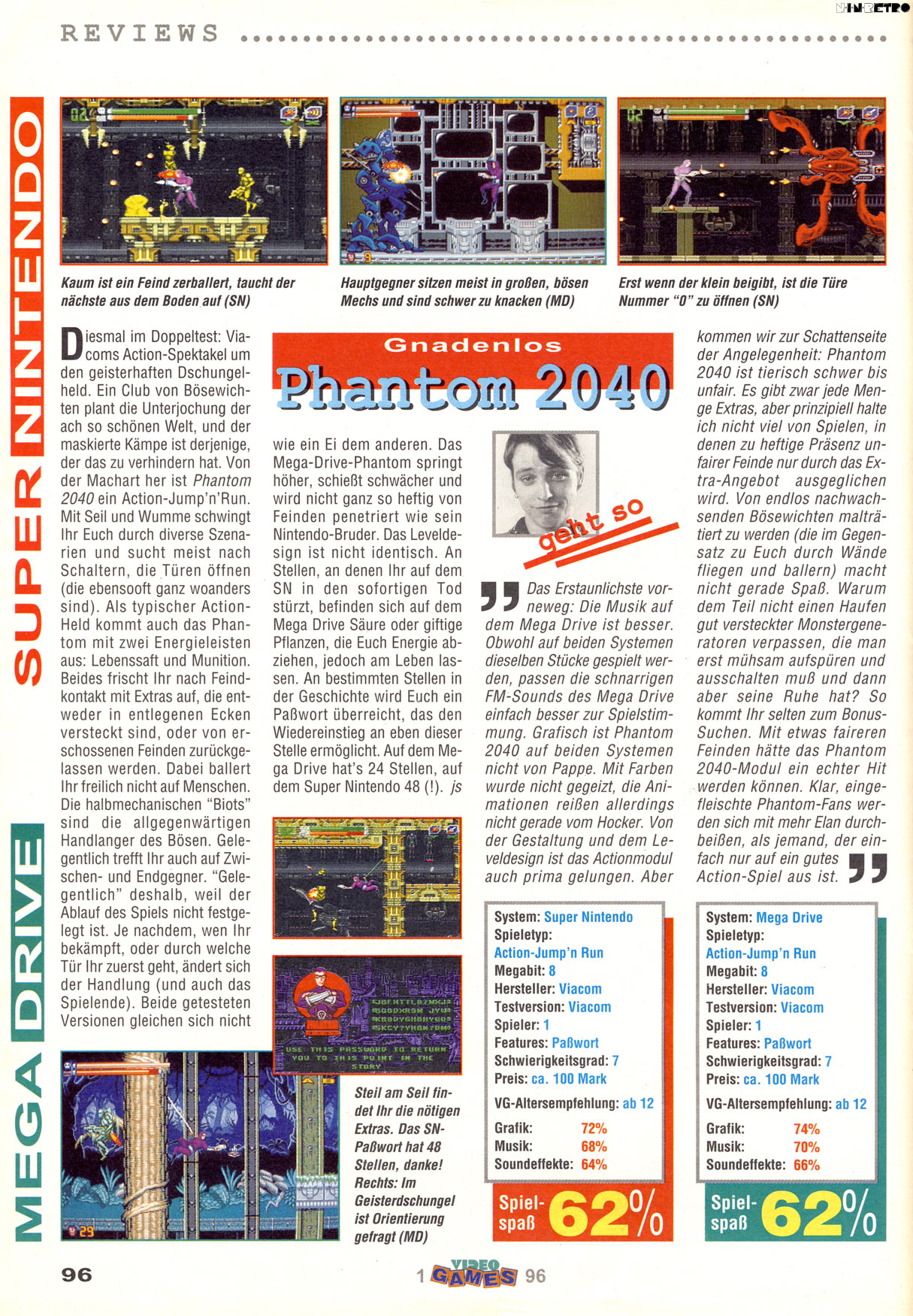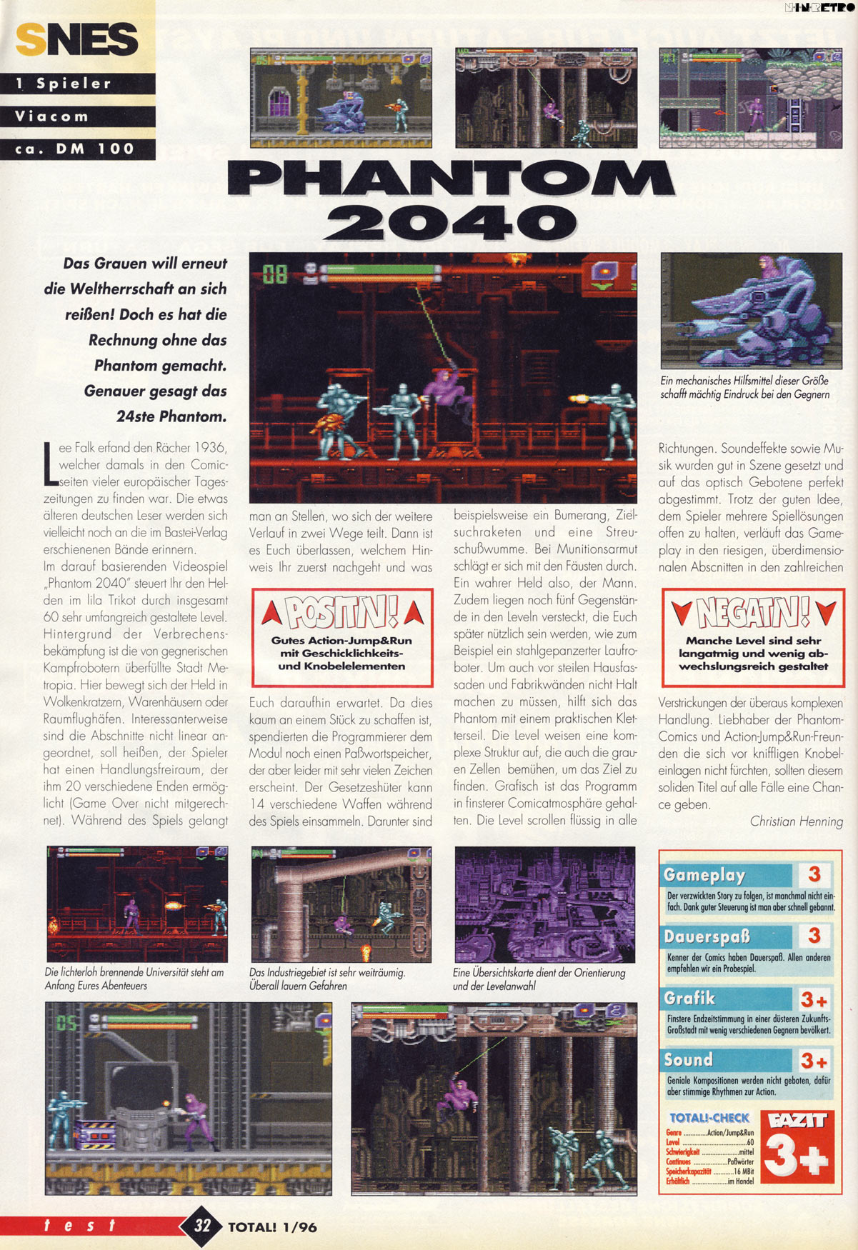 Als Teenager wußte ich in Phantom 2040 auf dem SNES deshalb weder was zu tun ist, noch in welcher Reihenfolge und warum eigentlich. Ich denke, dass die eher mäßigen Wertungen auch damit zusammenhängen, denn das Spiel ist eigentlich eine recht gute Mischung aus Action und 2-D-Adventure mit vielen Entwicklungsmöglichkeiten der Story und einigen verschiedenen Enden.