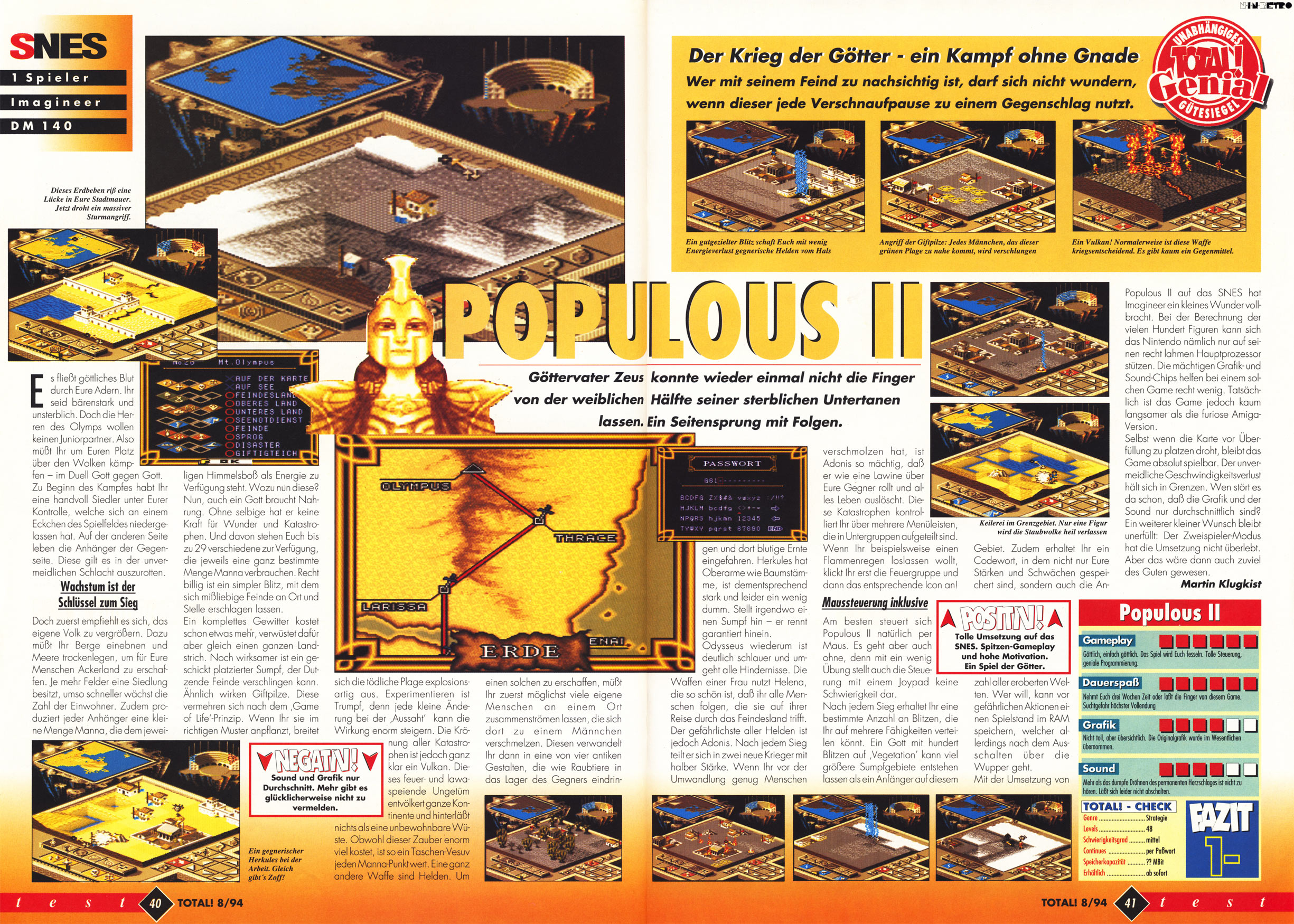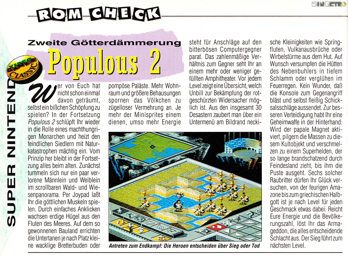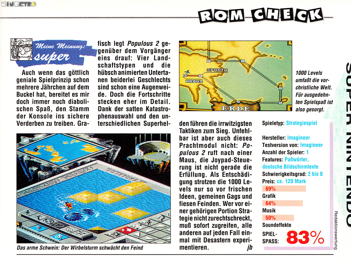 Populous 2 ist ein schönes Strategie-Spiel. Aber ohne Maus geht da nichts. Die Steuerung mit dem Controller ist totaler Müll. Der Sound...ja welcher Sound eigentlich. Ab und an piept mal was, aber ansonsten Stille. Das trifft sich aber auch ganz gut, so nervt eben kein Gedudel. Die Grafik ist auch mehr als schmächtig. Da wir ja jetzt im Nachhinein diese Spiele bewerten können, wissen wir das es auf dem SNES auch besser Grafiken usw. gegeben hat und daher finde ich die Bewertung von 88% ein wenig zu viel. Der Titel ist zwar gut, aber für eine Spitzenbewertung langts bei mir nicht.