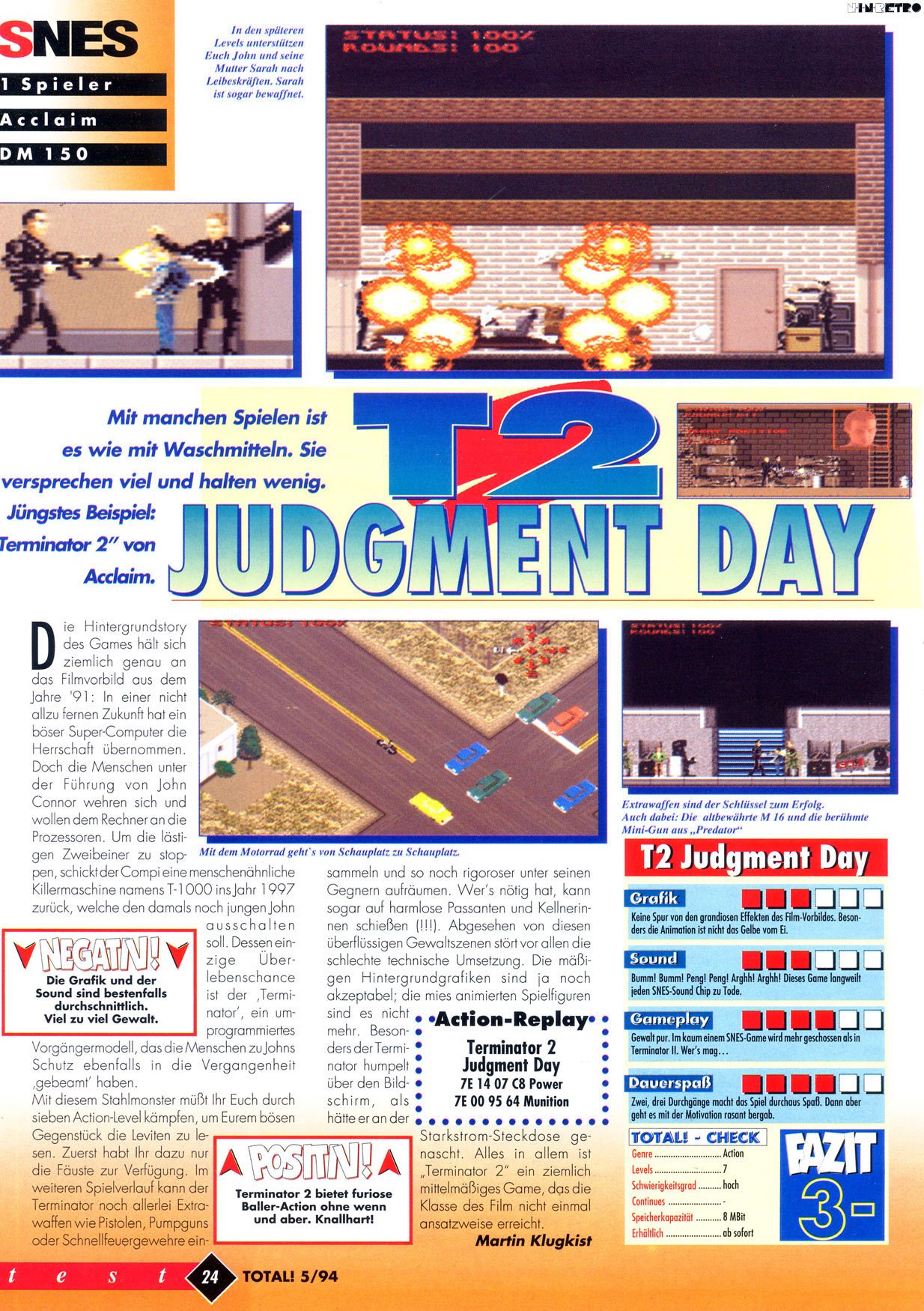 Destroy the shape-changing liquid metal T-1000! Race your Harley through an incredible 3-D map! Target trouble with your on-screen Head-Up Display! You are a T-800 Terminator: living tissue over metal endoskeleton, programmed to protect John Connor. Find John! Wipe out Cyberdyne Laboratories! Terminator the T-1000 in the ultimate metal-wrenching steel mill battle of the machines!