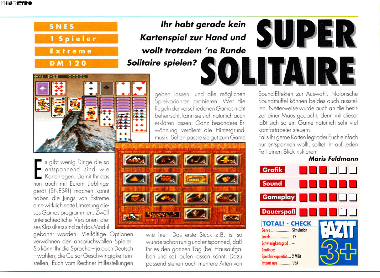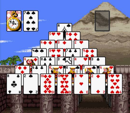 The classic card game of strategy and planning comes to your Super NES with 12 different Solitaire games in one Game Pak, including Klondike, Pyramid, Aces Up, Scorpion, Golf, even a poker variation. Conquer them all in the most challenging brain game you'll ever deal up.