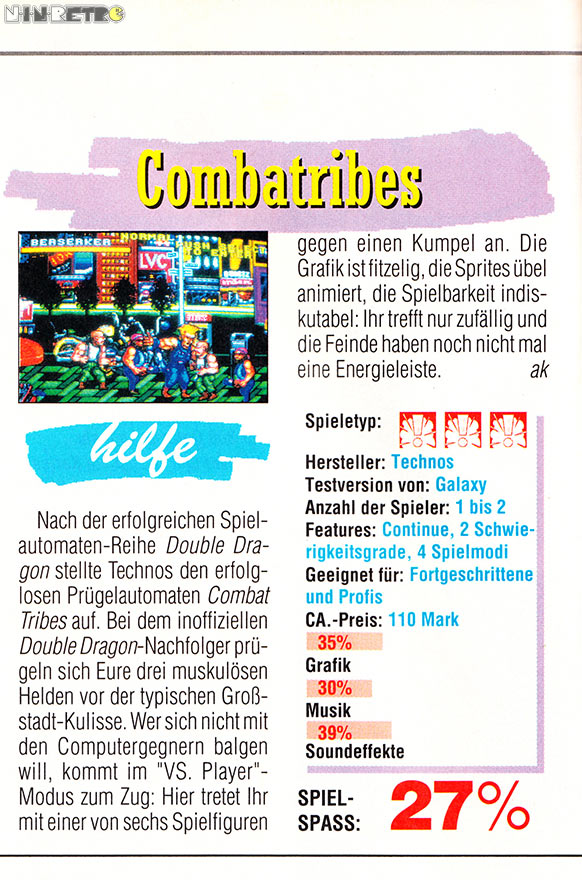 WTF?? 27%?? Combatribes ist eigentlich echt nicht schlecht, auch auf dem SNES. Es wurde zwar hier und da etwas geschnitten, aber insgesamt machts trotzdem noch viel Spaß und spielt sich auch recht gut, wenn man auch in späteren Stages öfter mal heftig auf die Fresse kriegt. Die Grafik ist ok - weder Hintergründe noch Animationen fallen besonders schlecht aus, Musik und Soundeffekte sind knackig und gehen gut ins Ohr. Dass die Gegner keine Energiebalken haben kann ich verschmerzen. Berüchtigt ist übrigens der Vorspann - ich sage nur "Ground Zero"... Von mir würde die SNES-Umsetzung von Combatribes so 75% erhalten, auf dem Flohmarkt würde ich es auf jeden Fall mitnehmen, gibt nur leider keine PAL-Version.