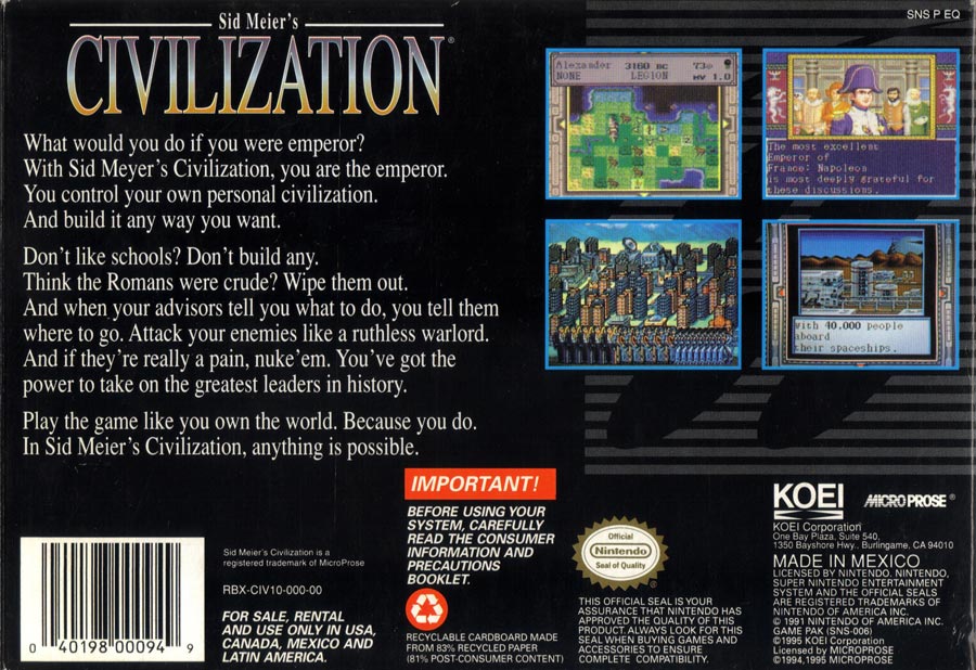 What would you do if you were emperor? With Sid Meier's Civilization, you are the emperor.You control your own personal civilization. And build it any way you want.