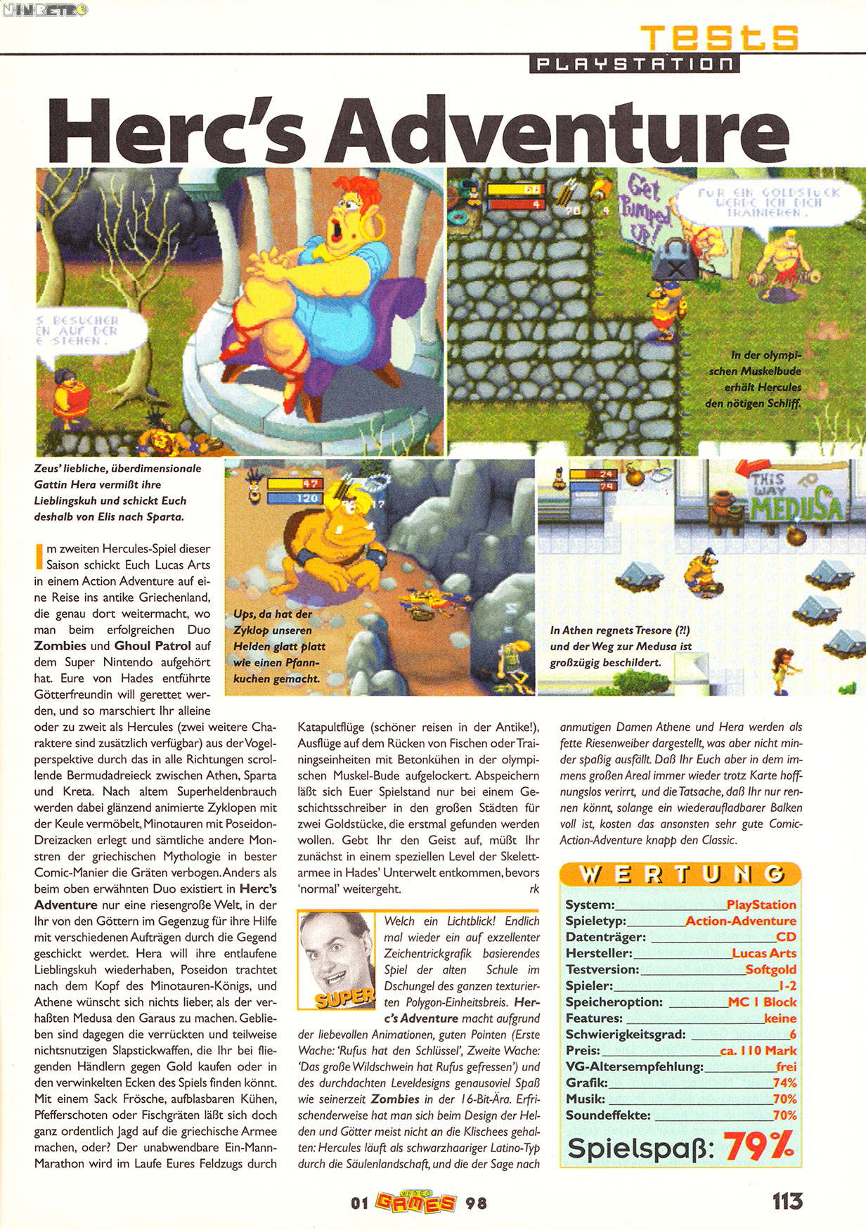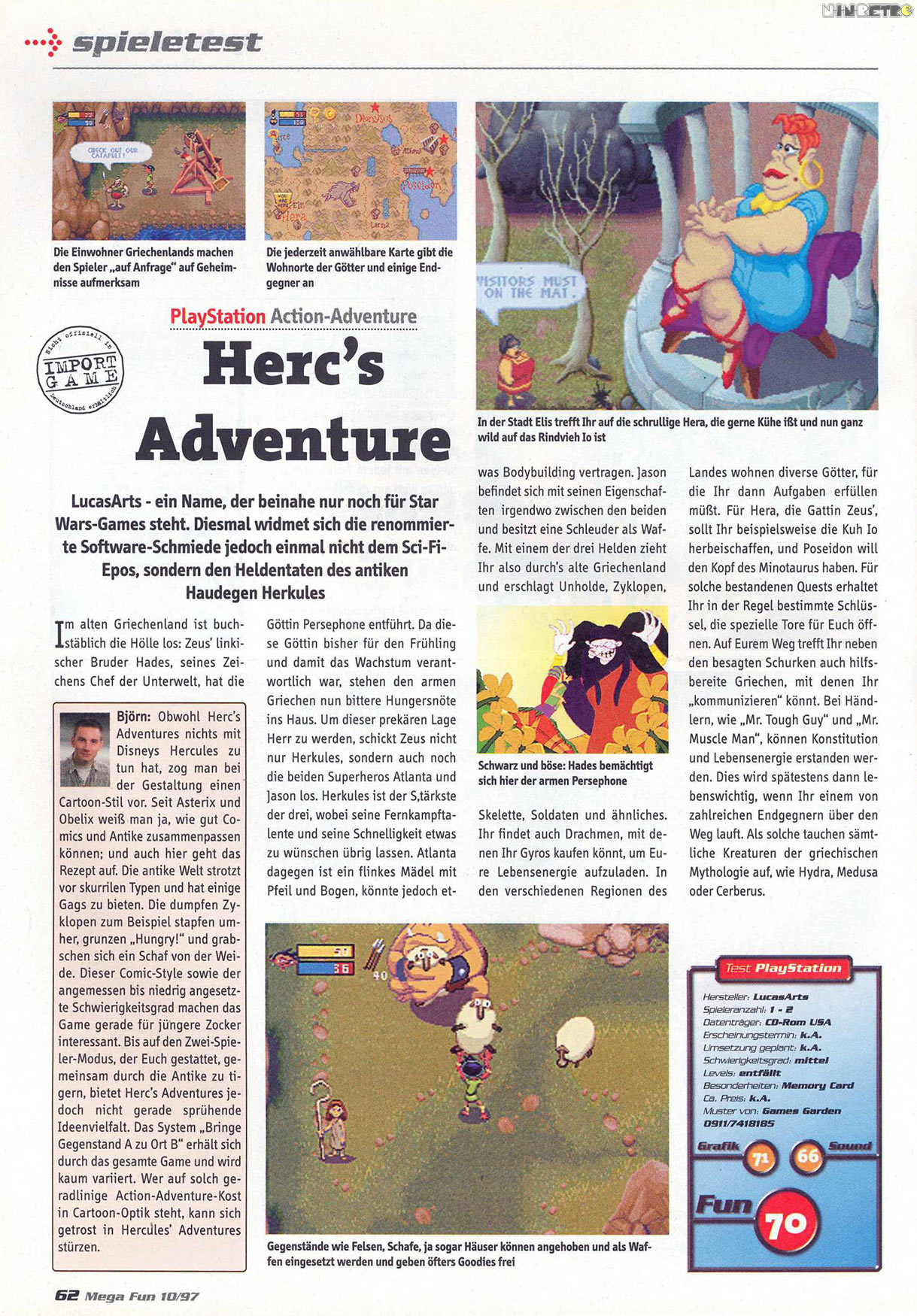 Wie sich die Dinge ändern können: Anderthalb Jahre zuvor meckerte derselbe Tester über Don Pachi, daß das Spiel grafisch und inhaltlich zu altmodisch und nicht genug "32-Bit" sei, bei Herc's Adventures freut er sich über ein "Spiel der alten Schule" mit schöner 2D-Optik.