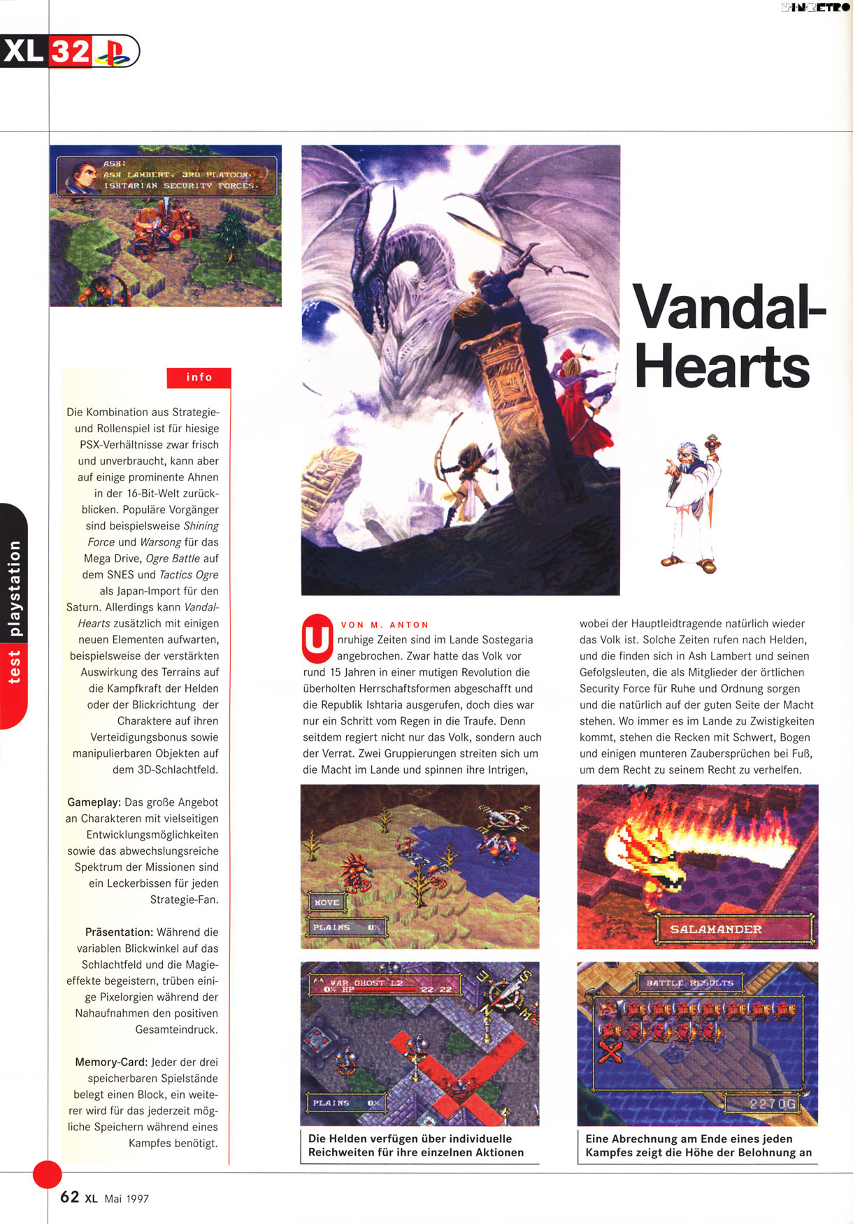 Kann mich nur anschließend, treffend formuliert. Diese beiden Titel gehören für mich zu den besten Genre-Vertretern für die Playstation. Final Fantasy Tactics ist sehr kindlich angehaucht...quasi das krasse Gegenteil von Vandal Hearts. Wenn man seine Protagonisten zuschlagen läßt...als ich das das erste Mal gesehen habe mußte ich eher schmunzeln. Das mit dem Blut ist sowas von übertrieben...aber egal. Vandal Hearts ist für mich das Suikoden der Strategiespiele, ein echter Geheimtip. Die Deutsche Übersetzung von Konami ist grottig. Schade eigentlich, denn die Fantasiewelt ist sehr gut eingefangen. Die technische Seite ist solala. Selbst für damalige Verhältnisse nur knapp besser als auf dem SNES. Aber das Gameplay: DAS ist die wahre Stärke bei diesem Titel. Das EXP-System mit den sehr gut durchdachten Charakterklassen ist schlicht, aber genial. Zu erwähnen bleibt mir noch, daß man das Spiel sogar ein zweites Mal gerne durchspielt...ich sage nur Ash der Vandalier.