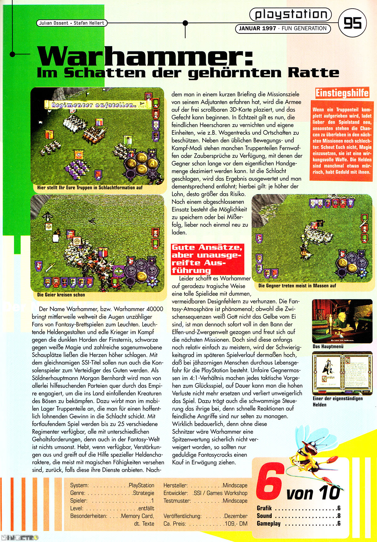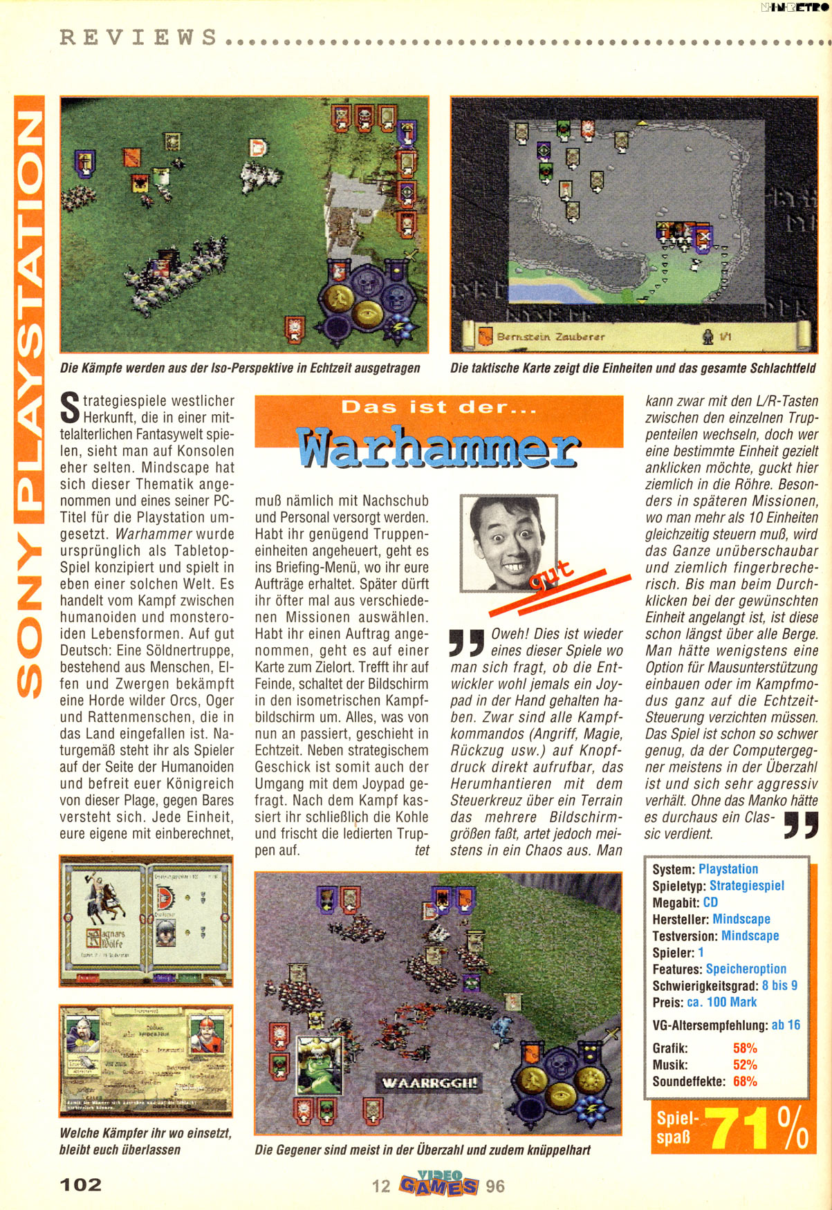 Ein absolut geniales Echtzeit-Strategiespiel auf der Playstation 1. Aber nicht wegen der Technik, sonders der Präsentation, den Ideen und deren Umsetzung. WOW. Das Fantasiereich ist absolut glaubwürdig und geht richtig gut rein. Wenn das Spiel nicht so sackschwer wäre. Warhammer ist auf jeden Fall ein Geheimtip, keine Frage. Aber nur für Strategie-Perfektionisten geeignet. Man braucht ein sehr dickes Fell...denn das bekommt man derart oft über die Ohren gezogen, daß es schon nicht mehr feierlich ist. Aber als Belohnung wartet ein Fantasiehappen, den man bis Heute auf Konsolen suchen muß!