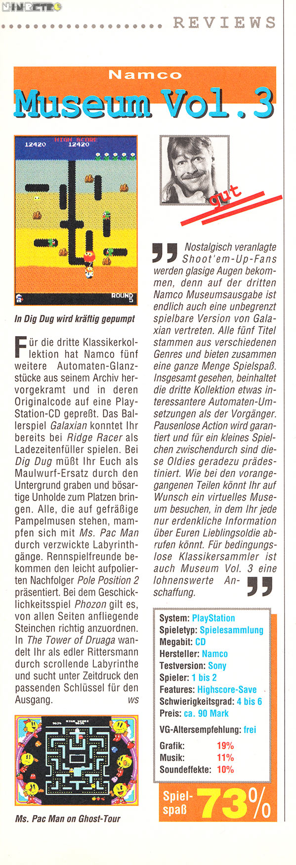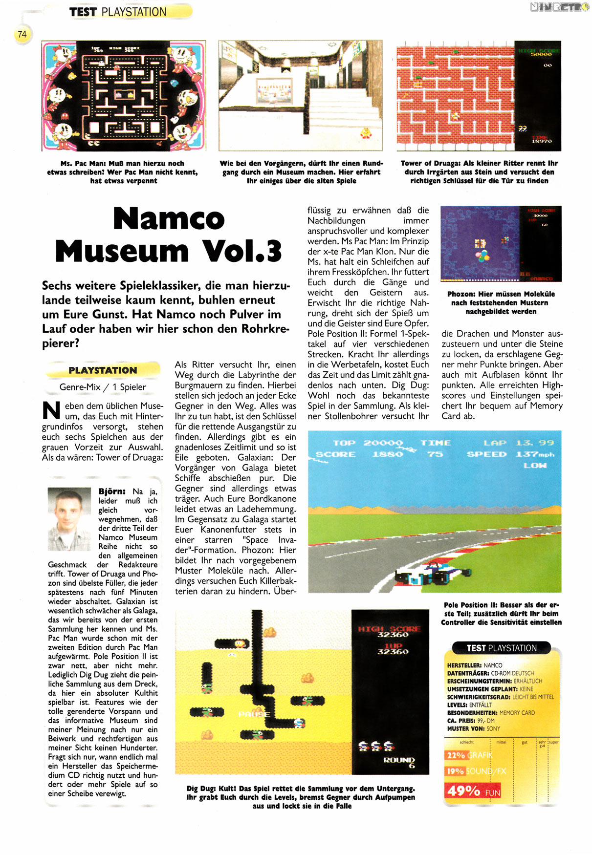 Namco Museum Vol. 3 offers up the most exciting titles found in our massive arcade archives, Galaxian, Ms. Pac-Man, Pole Position II, Dig-Dug, Phozon and The Tower of Druaga - all preserved in the Namco time-capsule so you can enjoy them today on the PlayStation game console.