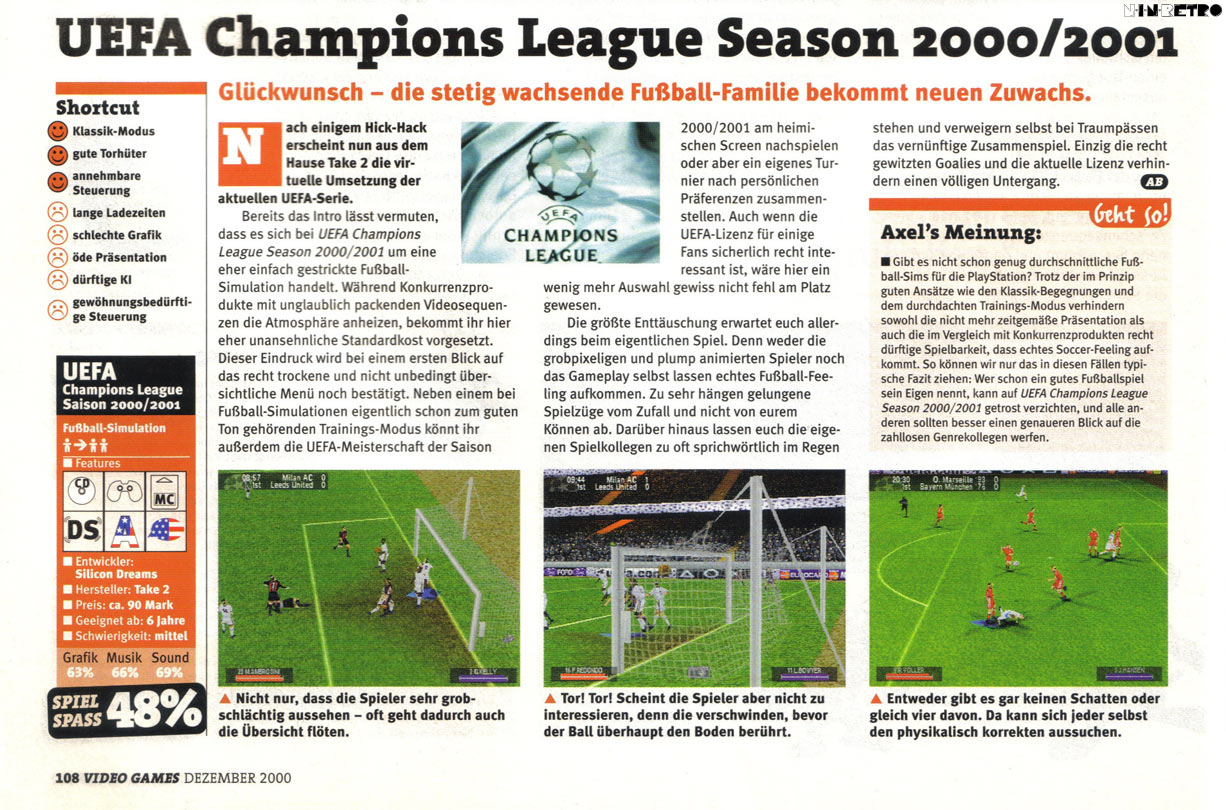 The UEFA CHAMPIONS LEAGUE is without doubt the most famous and prestigious football club tournament in the world today. The UEFA CHAMPIONS LEAGUE brings together some of Europe's most famous and finest teams, in the ultimate club football challenge. This Season's UEFA CHAMPIONS LEAGUE gives you the unique opportunity to play against Europe's leading clubs, whilst also offering you the option to take on previous winners, since 1960. The Official Video Game of The UEFA CHAMPIONS LEAGUE Season 2000/2001.