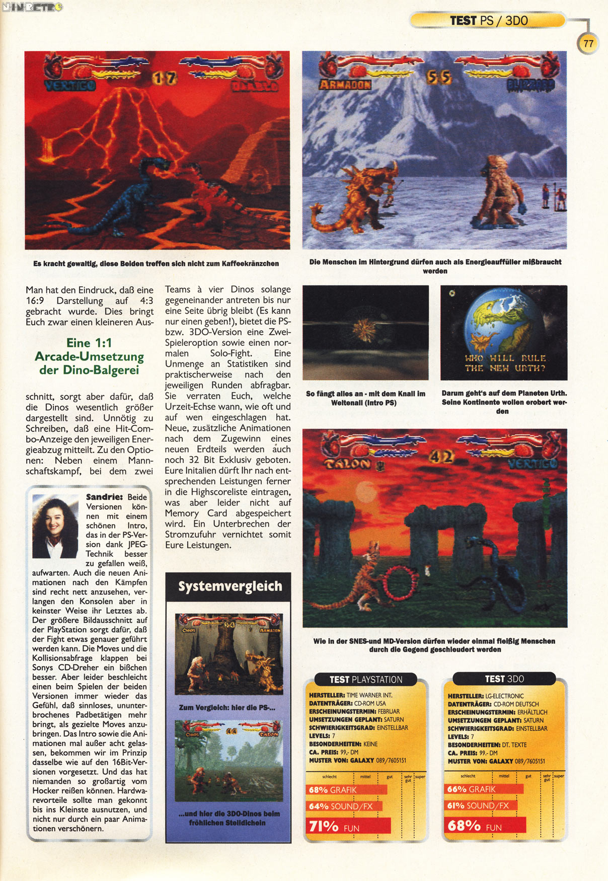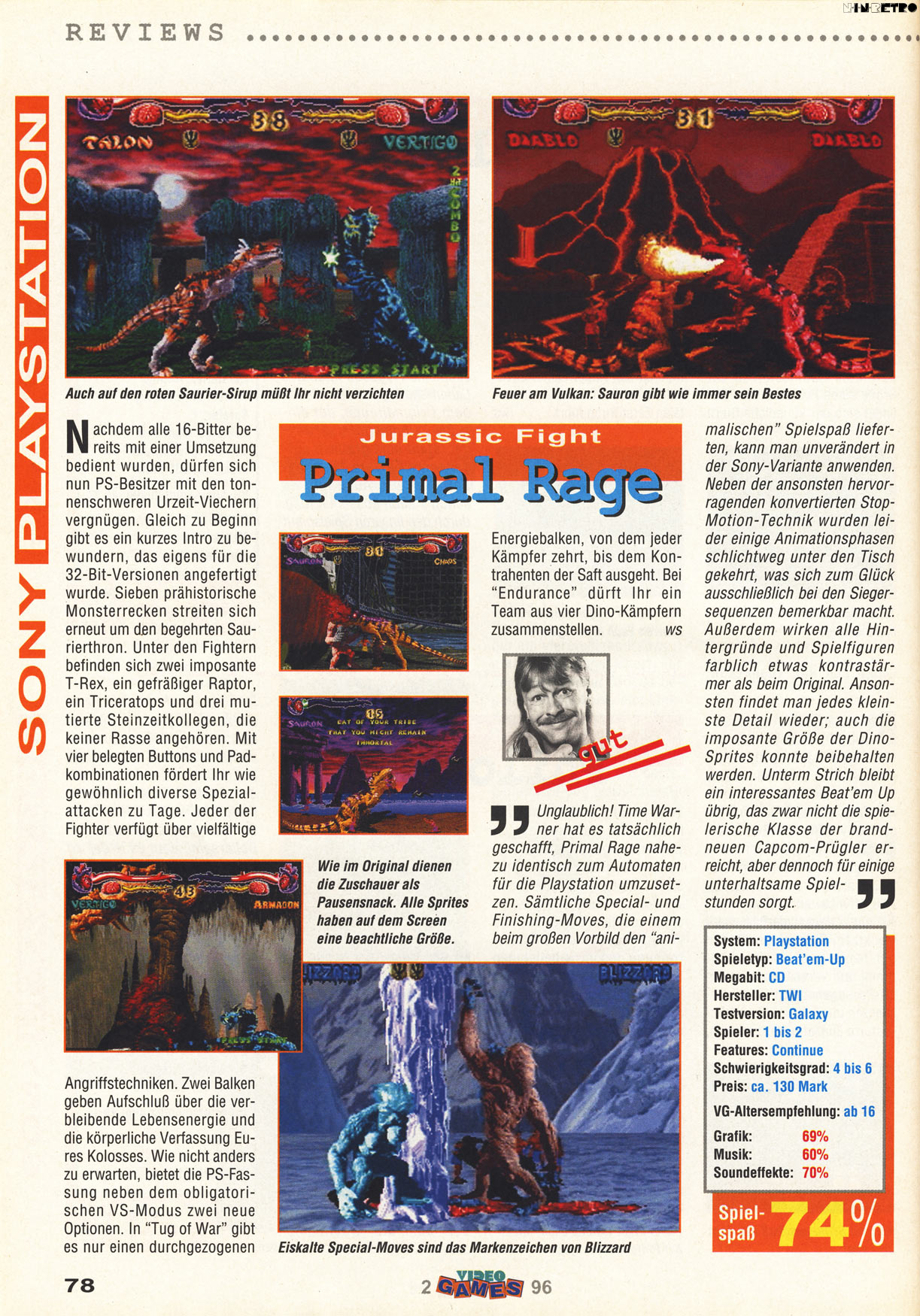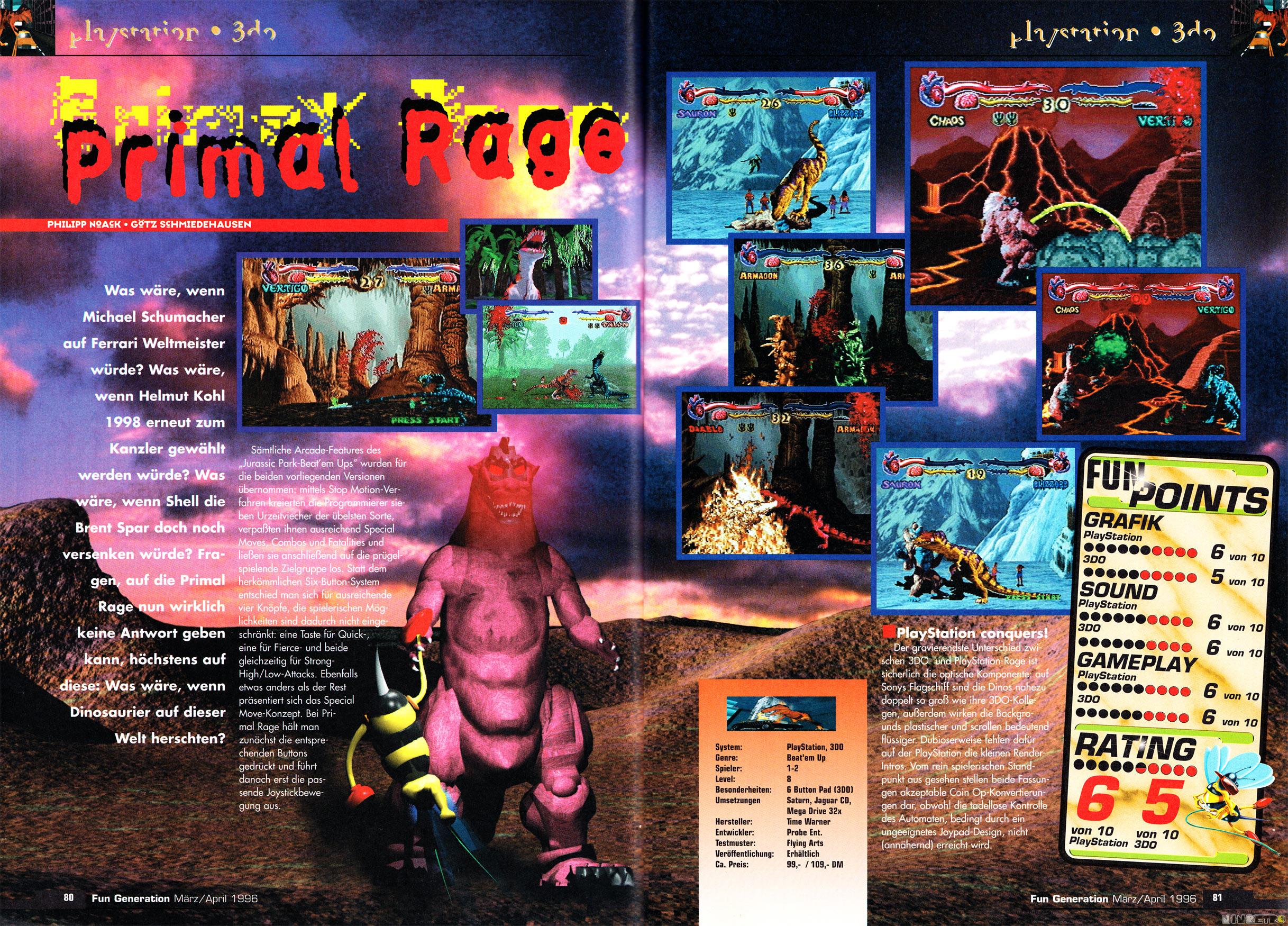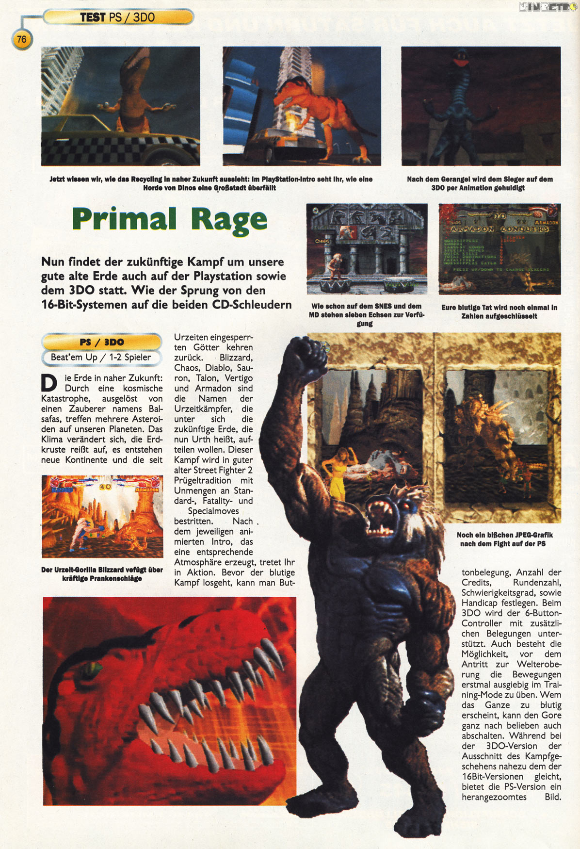 Der Arcade Renner Nr. 1, Beherrscher aller Spielhallen, ist los! Nur Primal Rage bietet komplette Einzelbild-Animationen, eine Wahnsinnsprogrammierung für phänomenale Schlagkombinationen und so viele Bewegungen, Spezialtechniken und spektakuläre Entscheidungsschläge, daß einem Hören und Sehen vergeht! Ein Spiel so hart wie... Wackelpudding?