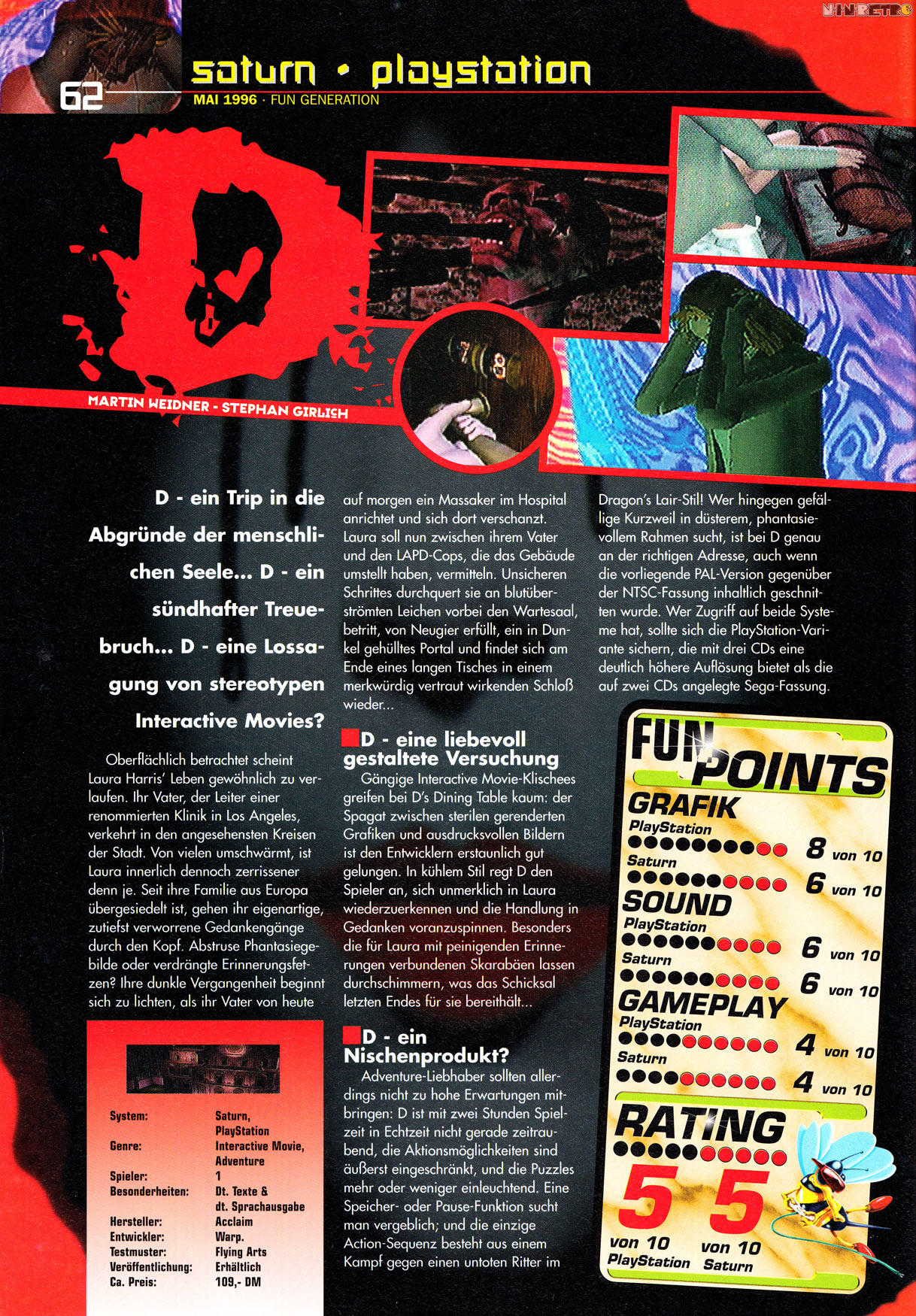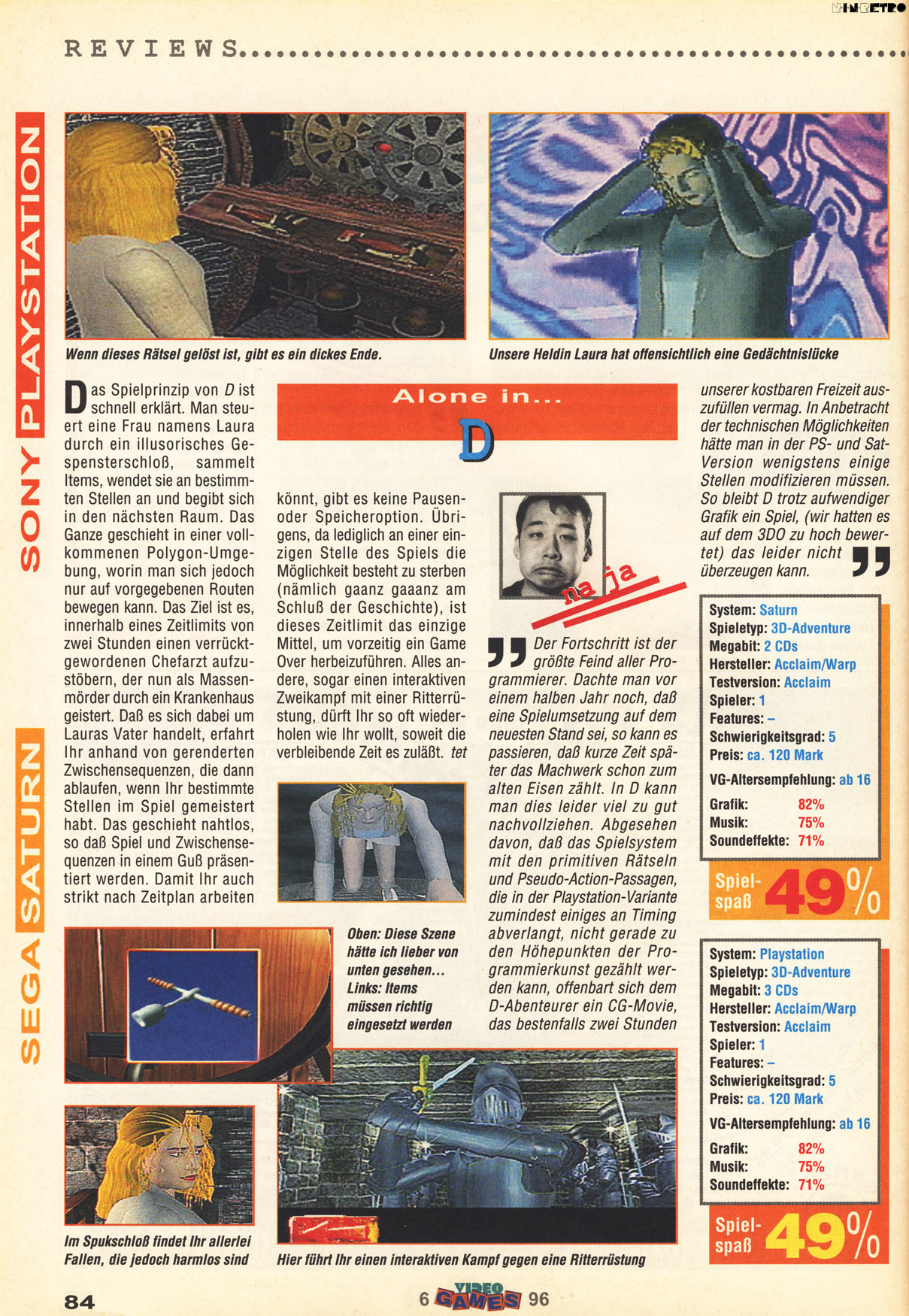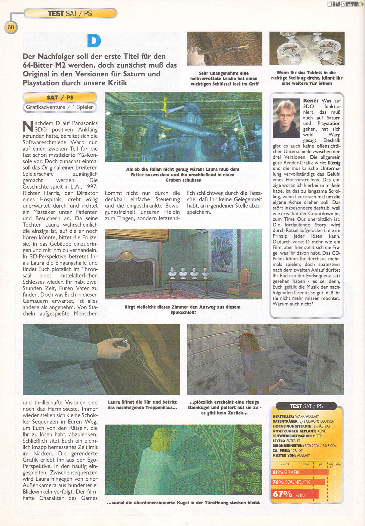 A full mood rises over L.A. National Hospital. Inside - the father, a doctor gone mad... but why? Outside - the daughter... the innocent, the seeker. You are about to enter the darkness forever! With stunning computer-rendered 3-D graphics. D's descent into the dark pit of your soul is a tour-de-force of terrifying secrets and challenges.