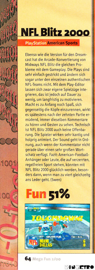 NFL Blitz 2000 continues the traditionof hard-hitting tackles and in your face arcade-style action!