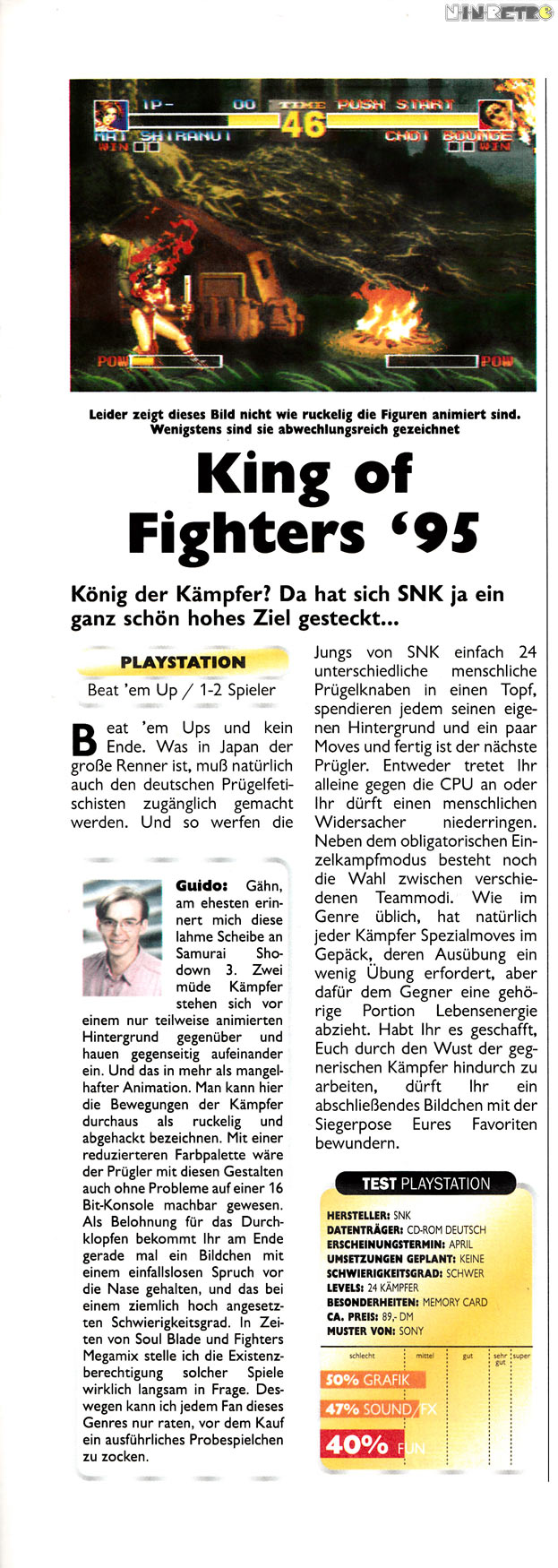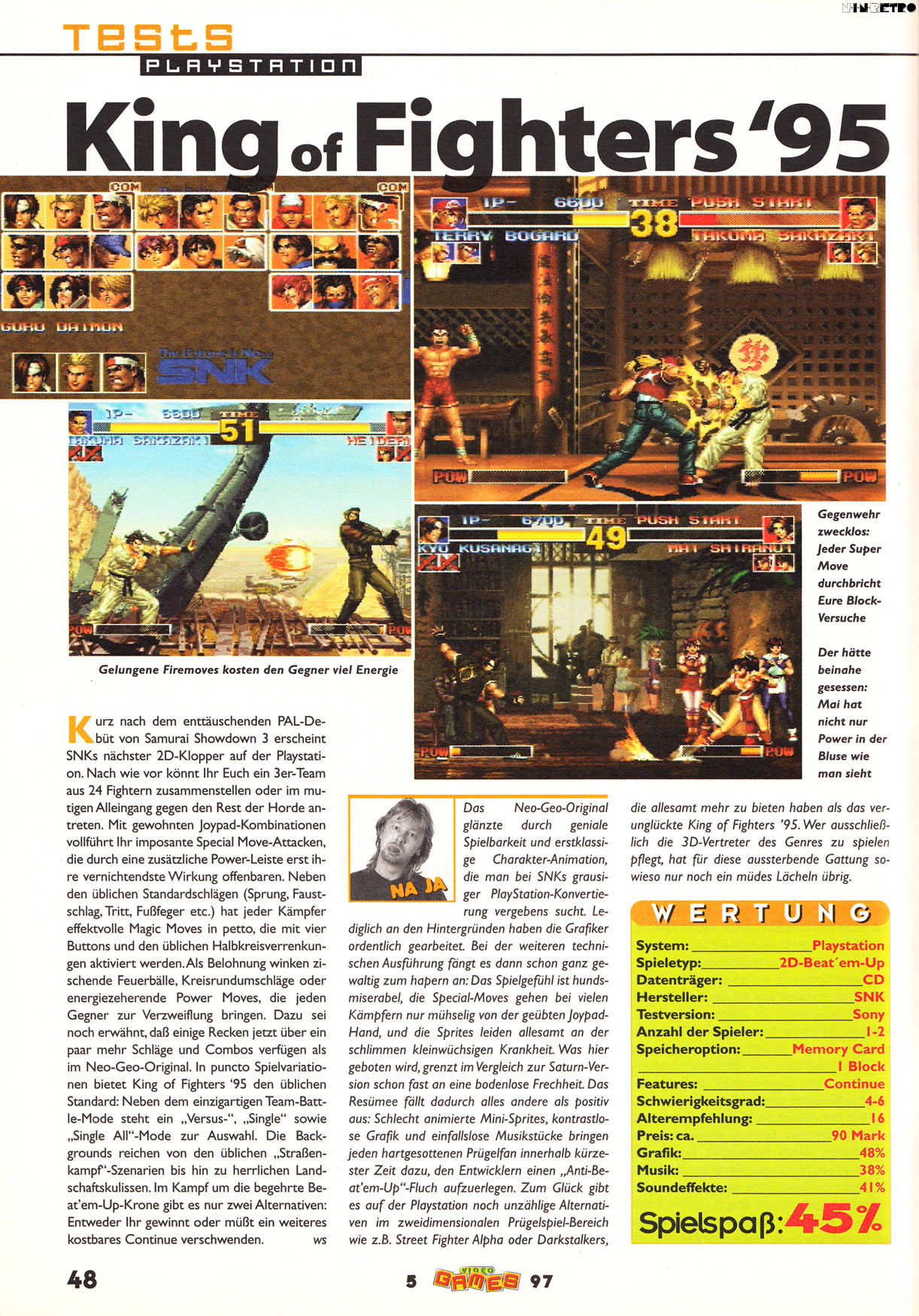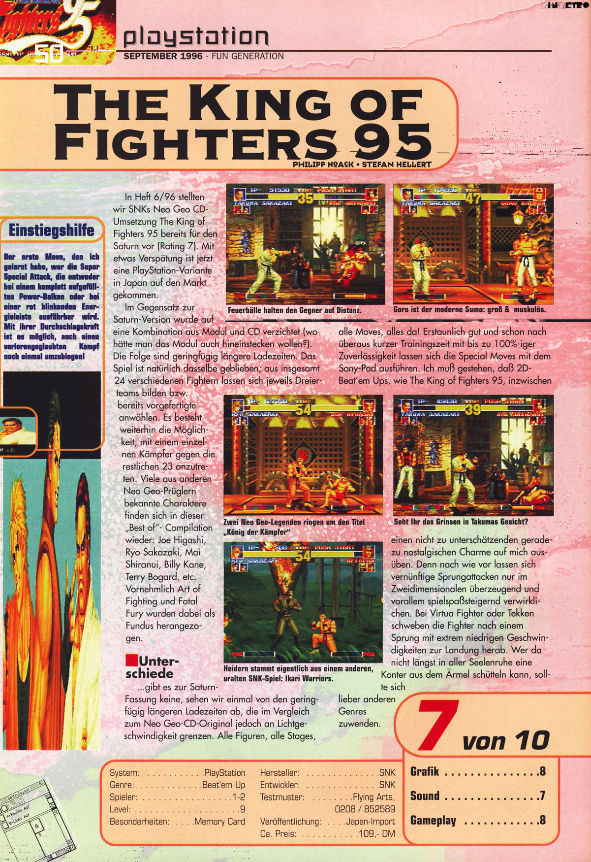 King of Fighters 95 ist keine gelungene Konvertierung. Die Steuerung ist irgendwie missglückt, im Vergleich zur Neo Geo Fassung habe ich zumindest das Gefühl, das Combos nicht so leicht durchzuführen sind. Die Grafik ist nicht ganz so schön und die Ladezeiten sind schon nervig lang.