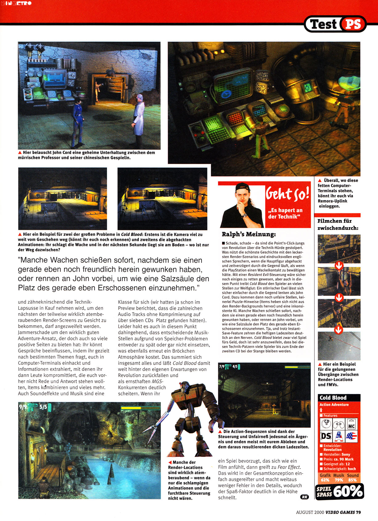 Die PC-Version fand ich (bis auf das schräge Ende) sehr gelungen und habe ich zweimal durchgespielt. Wenn die von der Video Games genannten Kritikpunkte hier zutreffen, dann muss die PSX-Umsetzung doch deutlich schlechter sein, denn bei mir hätte das Game bei einer 1:1 Portierung mindestens 80% abgestaubt. Die Story und die verschiedenen Locations sind auf jeden Fall ganz gut und teilweise sehr originell.