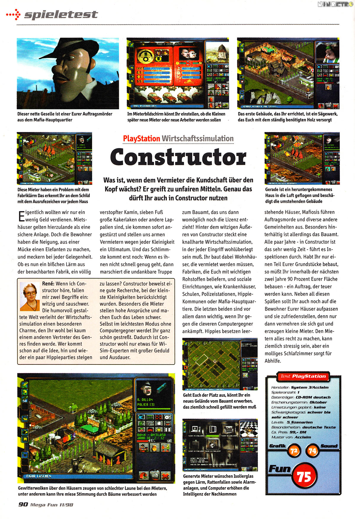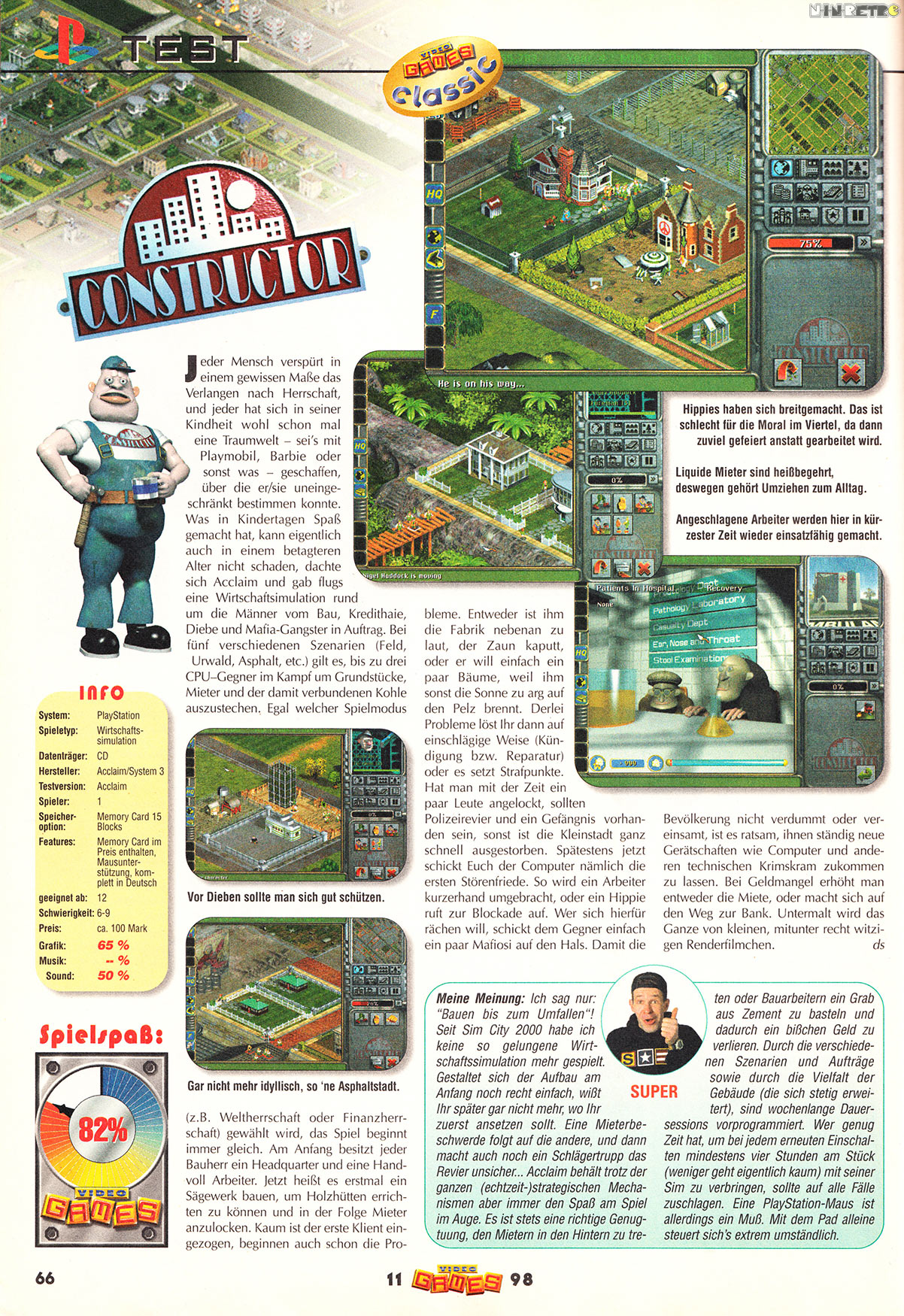 CONSTRUCTOR ist die spannendste, anspruchsvollste und witzigste Simulation aller Zeiten. Detaillierte Grafiken, unzählige Animationen, Videokonferenzen mit den kauzigen Bürgern der Stadt sowie wirklichkeitsnahe Finanz- und Bevölkerungsmodelle machen Constructor zu einer bahnbrechenden und wegweisenden Bau-Simulation.