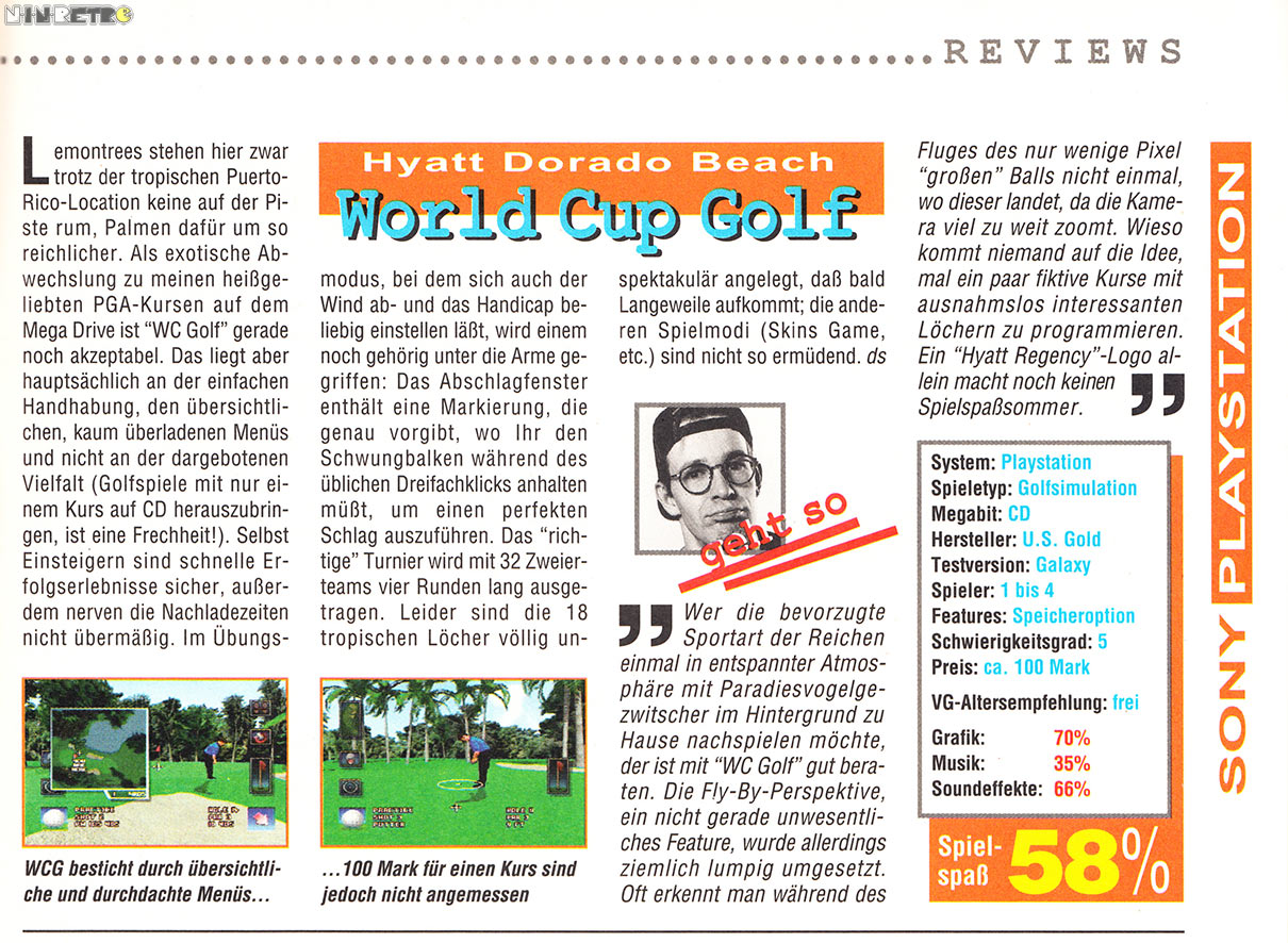 Spielt sich nicht schlecht und ist dank der Speicheroption ganz brauchbar...Ohne wäre man allerdings aufgeschmissen, da man den Ball perfekt treffen muss - sonst landet er gleich im Bunker oder "out of bounds". Naja, und ein Kurs ist für eine CD auch nicht gerade viel...