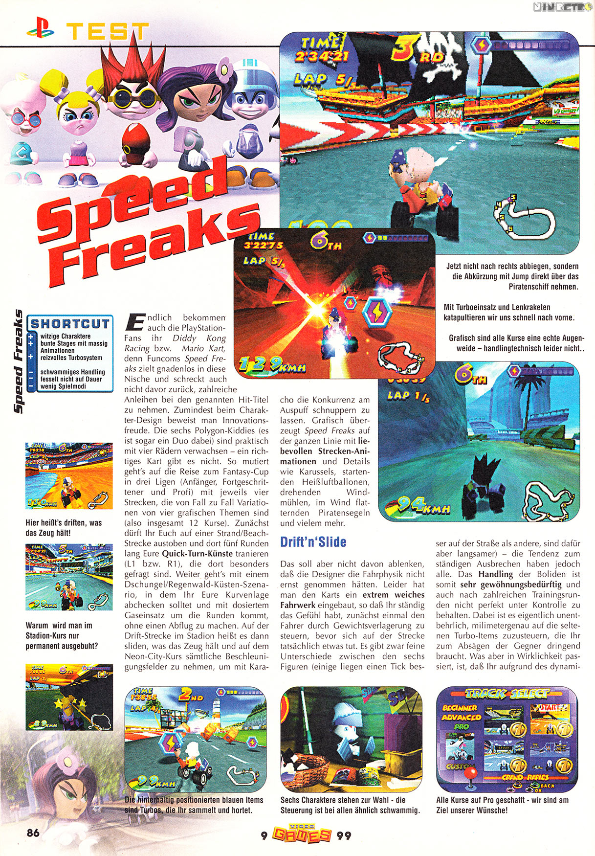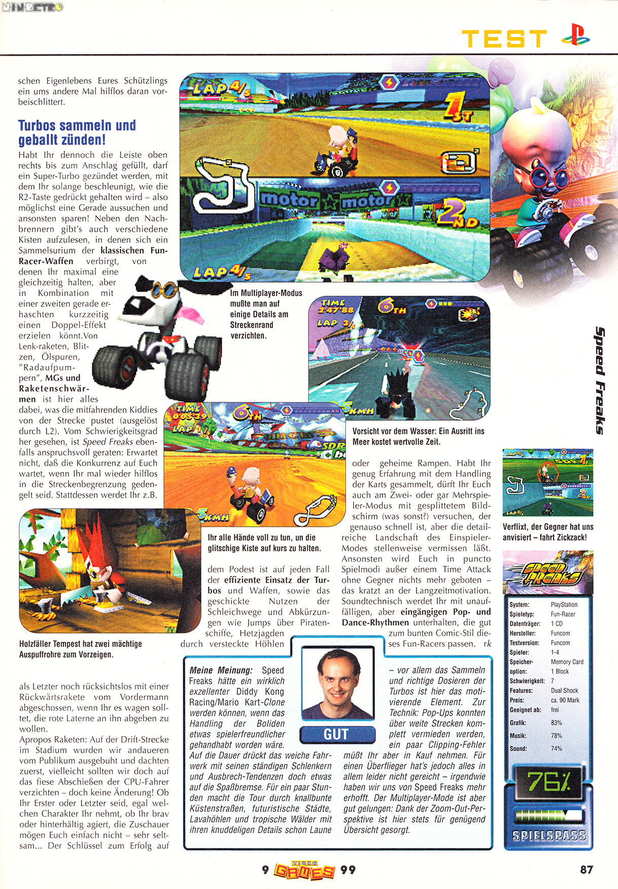 Momentan mein Lieblingsspiel auf der PS1. Es dauert ein paar Wochen, bis man sich an die Steuerung gewöhnt und alle Strecken und Charaktere freigespielt hat, aber dann geht's wirklich ab. Grafik und Musik gefallen mir auf jeden Fall besser als bei "Crash Team Racing", die Gegner sind allerdings ziemlich unfair - da kann es passieren, dass man pro Rennen 10x abgeschossen wird (ärgerlich, wenn man die Gegner schon fast überrundet hat und dann trotzdem nur Dritter wird ).