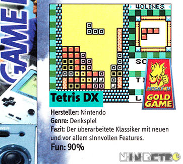 Ich finde Tetris DX deutlich besser als das Original. Es gibt vier verschiedene Modi und die Farben sind sehr schön anzusehen, außerdem ist die Steuerung deutlich präziser. Hier hat man nicht nur die Möglichkeit Highscores zu speichern, sondern man kann auch 3 Spielstände anlegen und es wird pro Spieler eine kleine Statistik gespeichert. Allen Tetris-Freunden sei dieser Titel daher empfohlen.