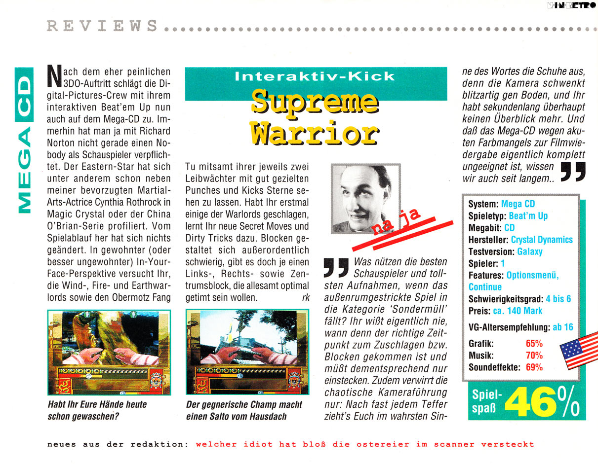 The savage warlord Fang Tu promises to put everyone's heart on a stake unless he gets the mask that you have secreted in your sack. Your old master Kai delivers the warrior's challenge: you must battle each of Fang Tu's warlords, gain their special power and defeat Fang Tu in order to save the day! Along the way, the beautiful Yu Ching, another of Master Kai's students, will give you what help she can.