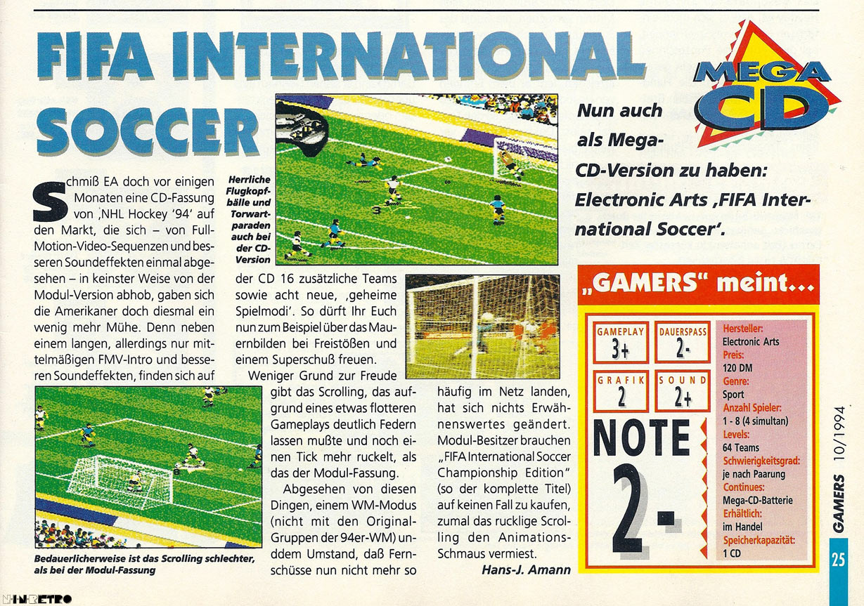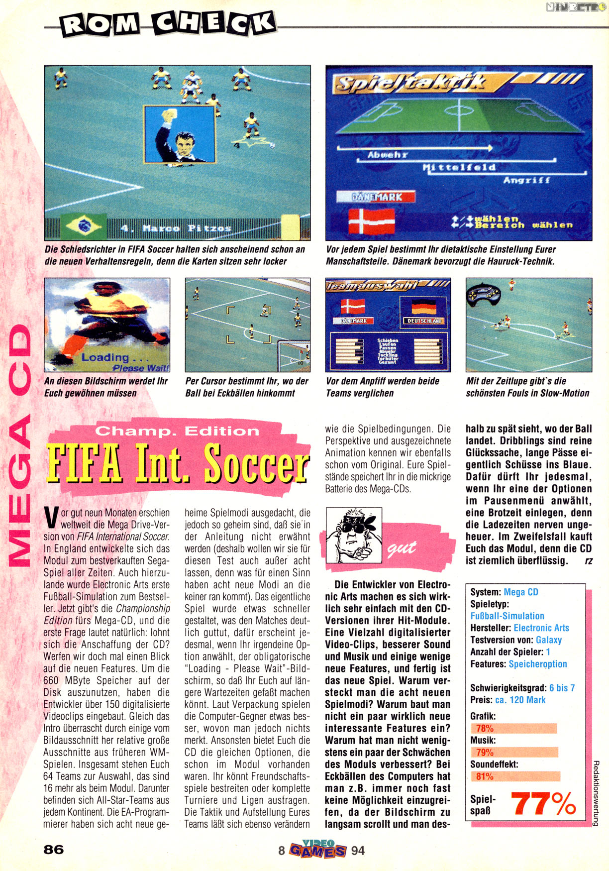 Die NAchfolger auf dem MD wie Fifa 95 usw. sind moderner und damit besser. Der Sound und die Videos sind jedoch auf dem Mega CD das Aushängeschild für das Spiel.