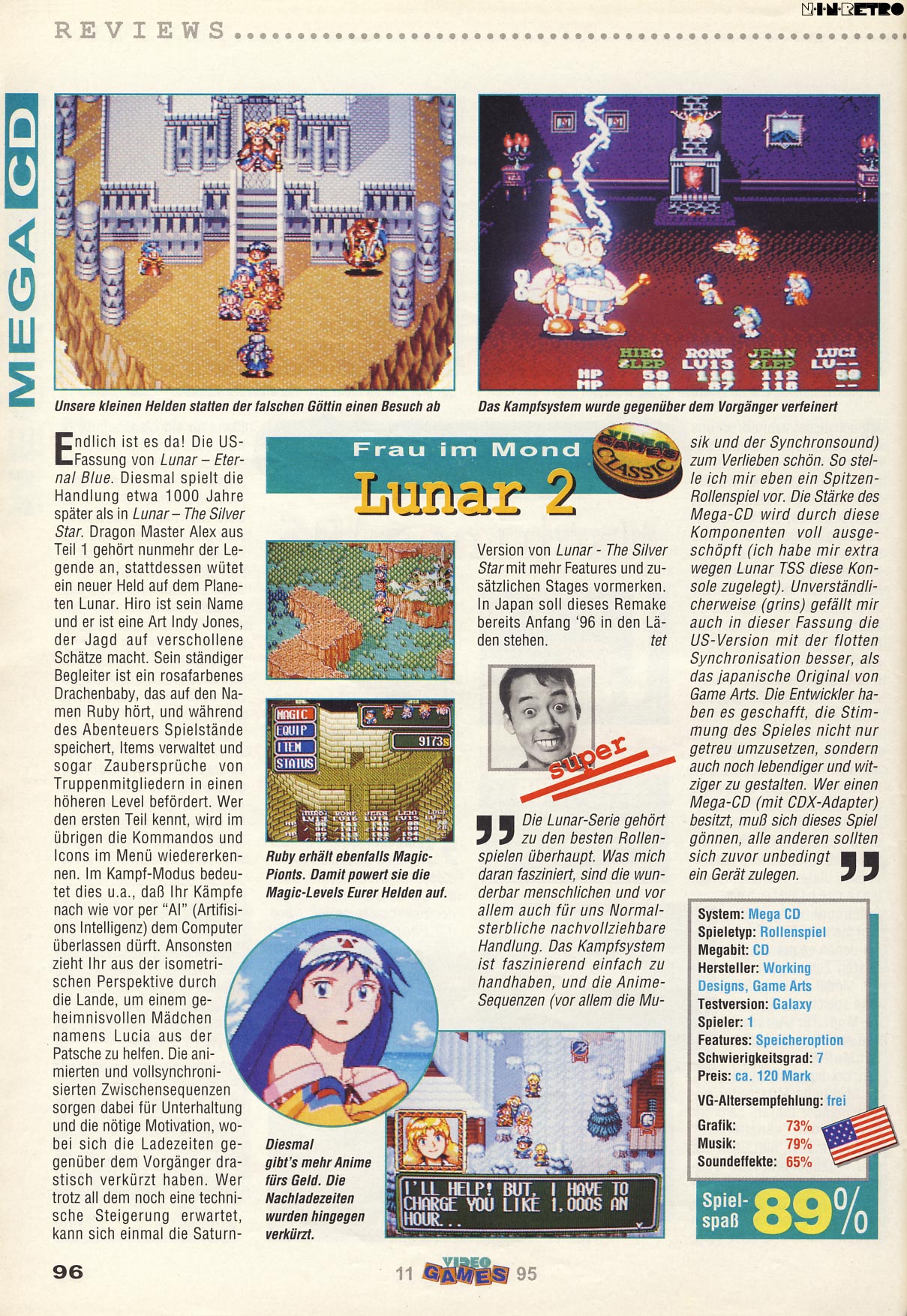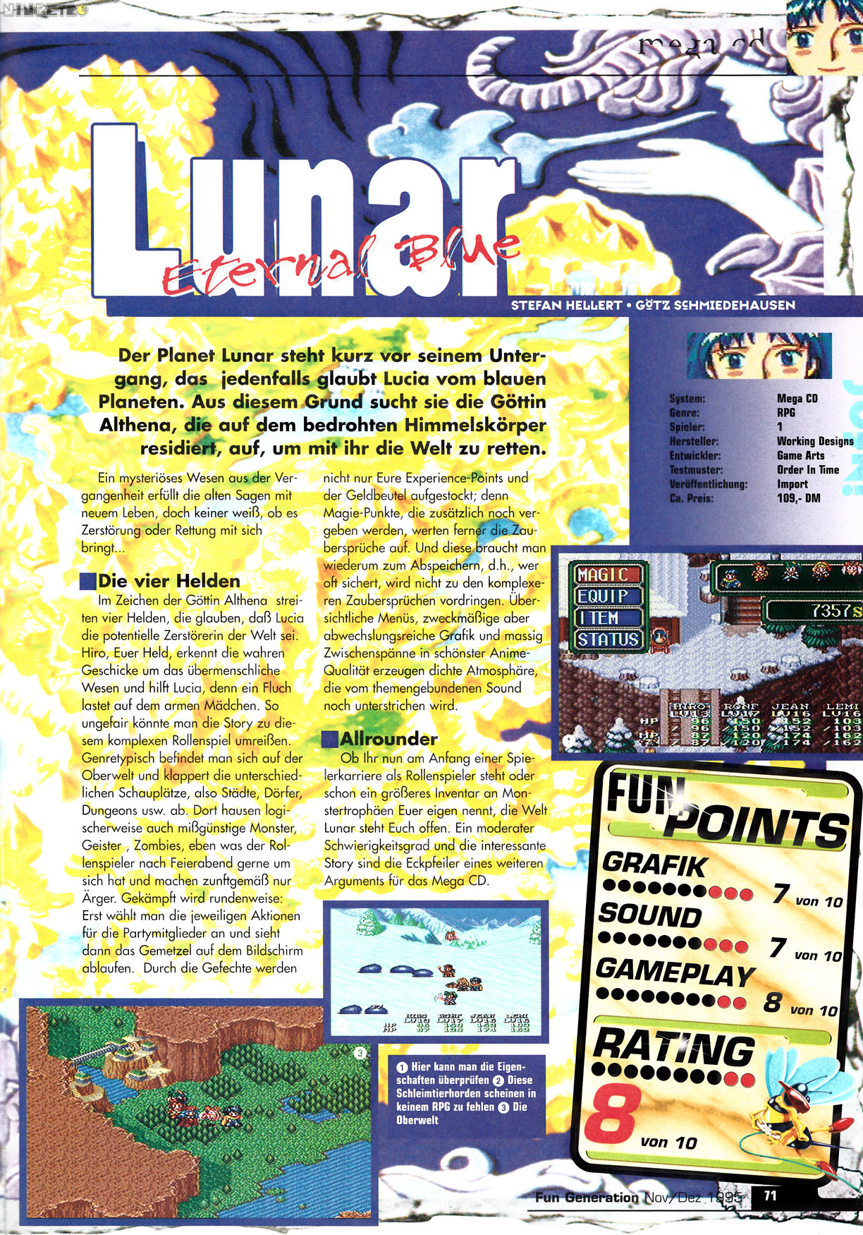 Come back to the enchanting world of LUNAR! Join Hiro and Ruby 1.000 years after the conclusion of the first adventure, als they work to unlock the secrets of the Blue Spire and the strange young girl they found within it! But be careful! Forces are at work trying to revive the evil Zophar and immerse LUNAR in darkness forever! Journey to distant lands in search of the Goddess Althena, who may be the only one powerfull enough to stop Zophar. Along the way, you'll meet exciting new characters, fight fully animated monsters, traverse snow-covered mountain peaks, and crawl through slimy dungeon depths as you work toward the terrifying climax! And, thanks to the tremendous storage power of CD, LUNAR contains over 50 minutes of awesome cartoon-quality animation sequences and over one and a half hours of dialogue! What are you waiting for? Go ahead, you deserve to be the hero for once.