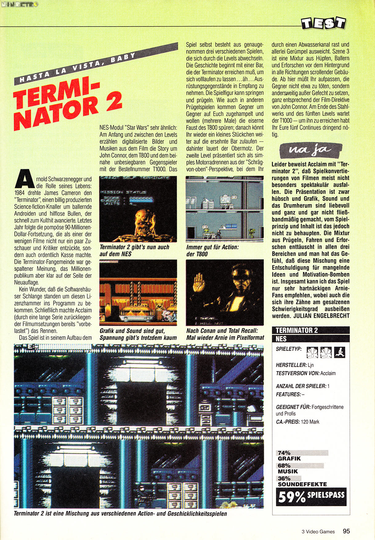 It comes from the future. It can take any shape and survive almost any injury (even when a 10-gauge shotgun blast opens it up like a tin can). Its mission: eliminate John Conner. Its name: the T-1000. "Trust me on this." Against it stands one hope: you, a terminator, model T-800... equipped with on-screen target search display, a level-action Winchester, and 10 barrels of high-explosives... one mean machine.