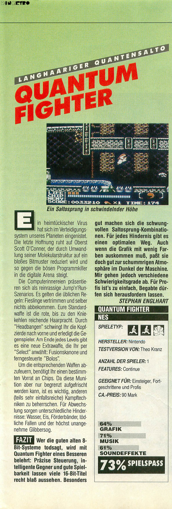 The setting - Earth, the future. The defense computer protecting the entire planet has been invaded by a constantly mutating, evolving virus. One lone volunteer has the courage to face the virus on its own ground. Converted to raw data and transferred into the circuits of the computer, the molecular structure of this brave warrior is transformed by the as-yet untested Image Transfer System. Into the circuits of the computer steps an unlikely hero - the Quantum Fighter! Six levels of challenging action, unequalled game control, and a surprising arsenal of weapons!