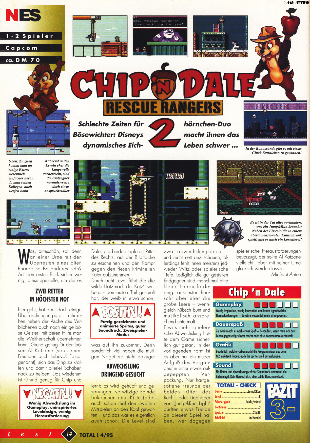 Den Vorgänger habe ich sogar nur alleine gespielt, weil ich derartige Jump 'n' Runs immer schon gerne nur im Single-Player gespielt habe. Die Chip 'n' Dale-Spiele müssten aber ohnehin zu den wenigen Genrevertretern auf dem NES zählen, die man gleichzeitig zu zweit spielen kann.