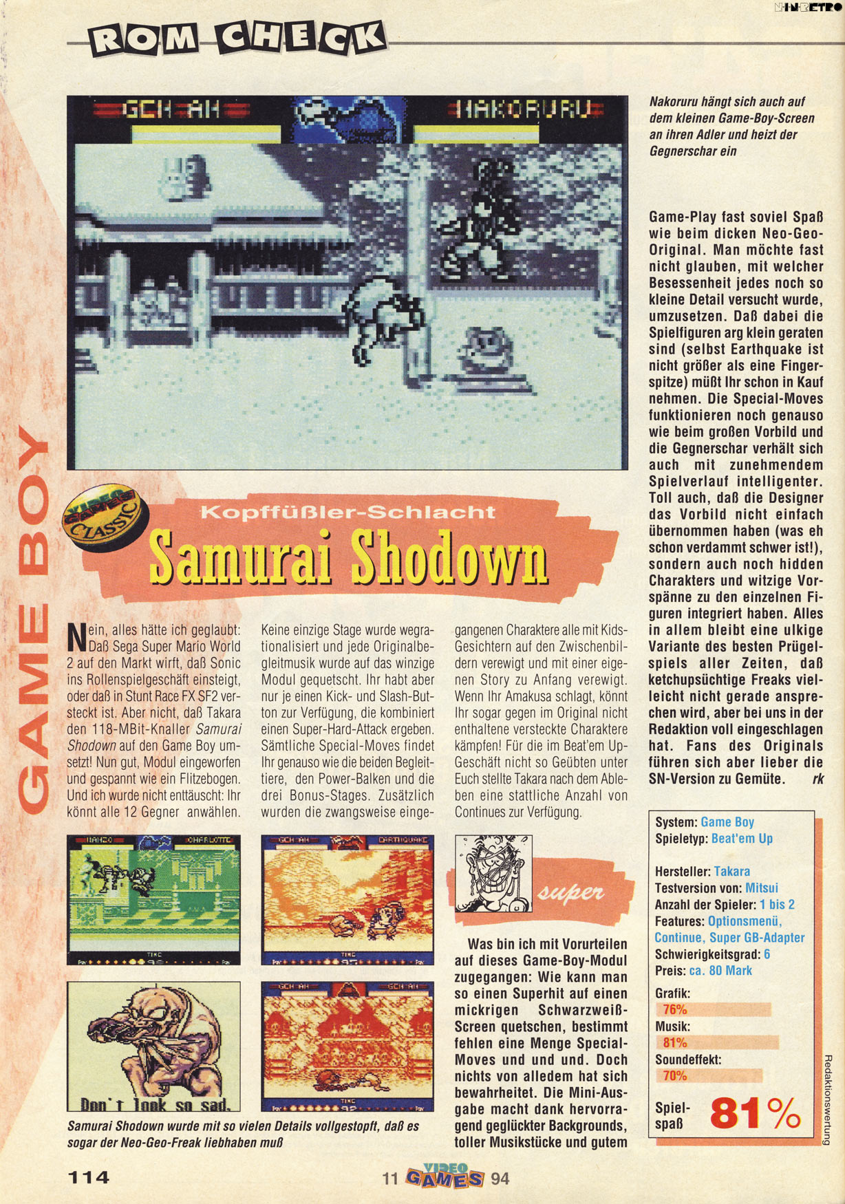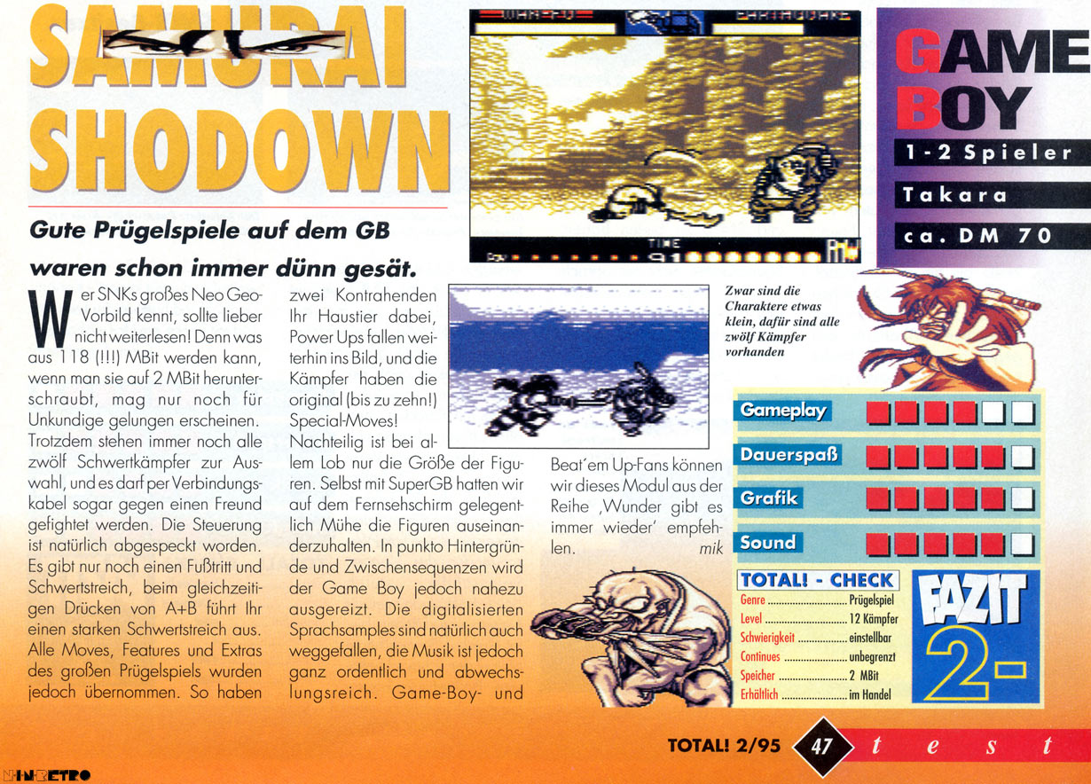 Ja die Handheld-Versionen haben ihren eigenen Charme. Mir habe beide (GB und NGP) sehr gut gefallen. Auf dem Gameboy gibt es eh nicht so viele gute Prügelspiele und wenn man mal vergleicht gehört Samurai Shodown hier sicher mit zu den besten.