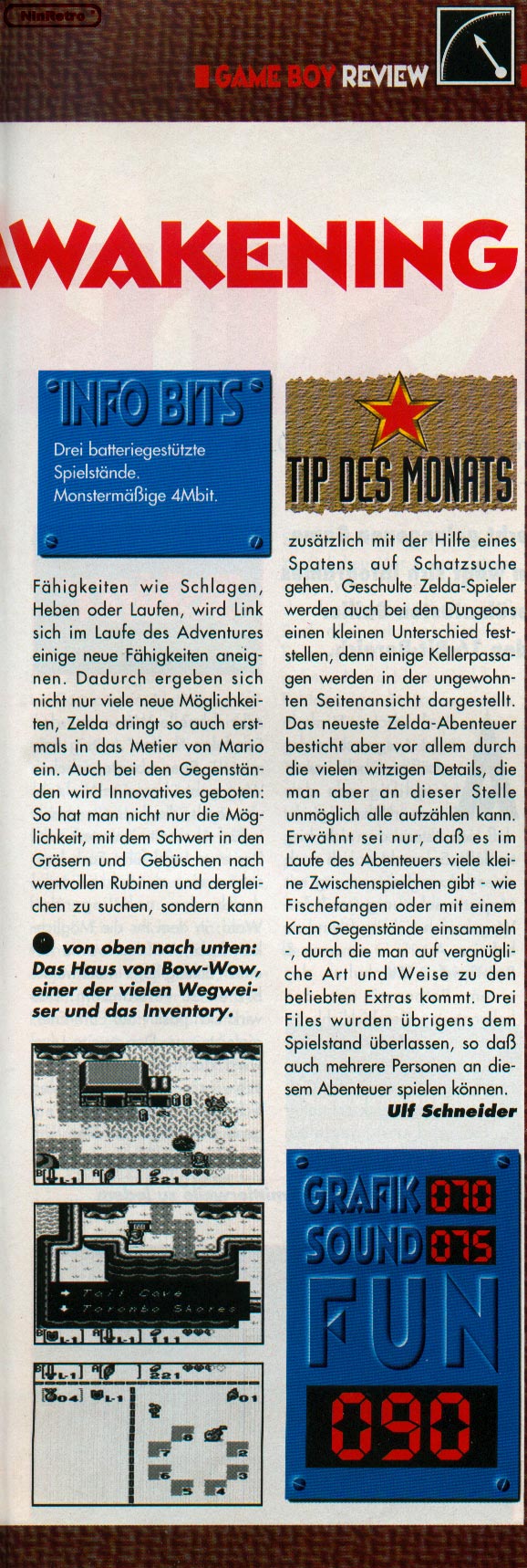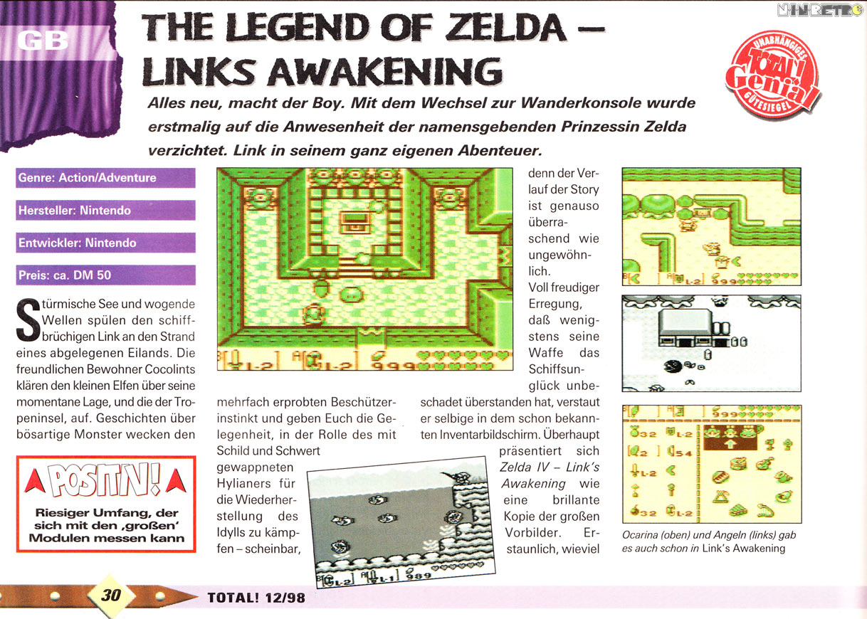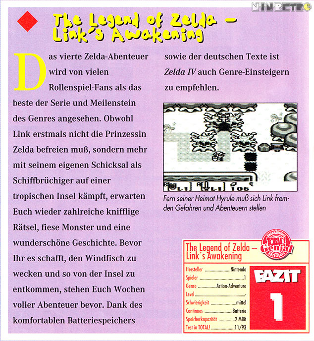 Deutscher Bildschirmtext und eine batteriegestützte Speicherfunktion versprechen ungetrübte Abenteuerlust, wenn Du mit Link den Geheimnissen der Insel auf den Grund gehst.
