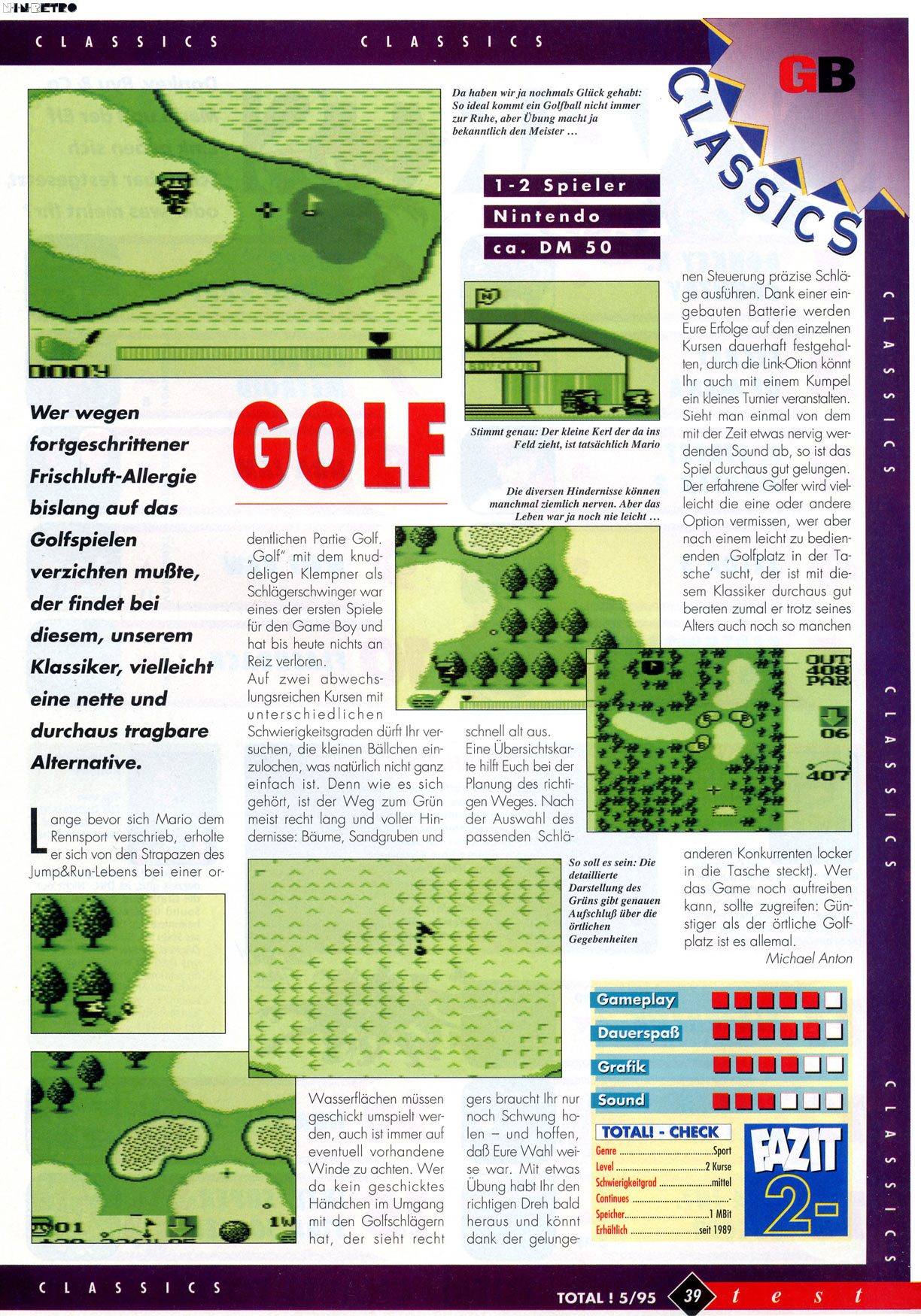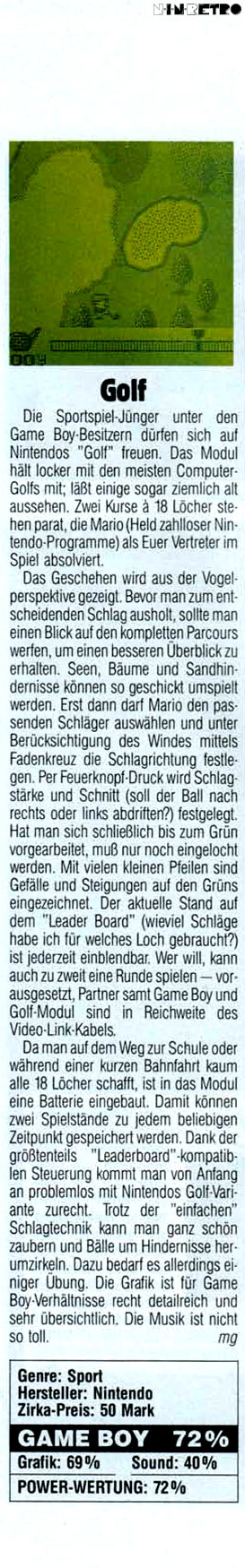 Ja, "Golf" war wirklich super. Auch als Kind und Nicht-Golfer hab ich mich sofort zurechtgefunden. Und es hat richtig Spaß gemacht. Muss ich mal wieder spielen, am besten auf dem Super-GB - werd gleich mal morgen auf dem Frankfurter Flohmarkt danach gucken.
