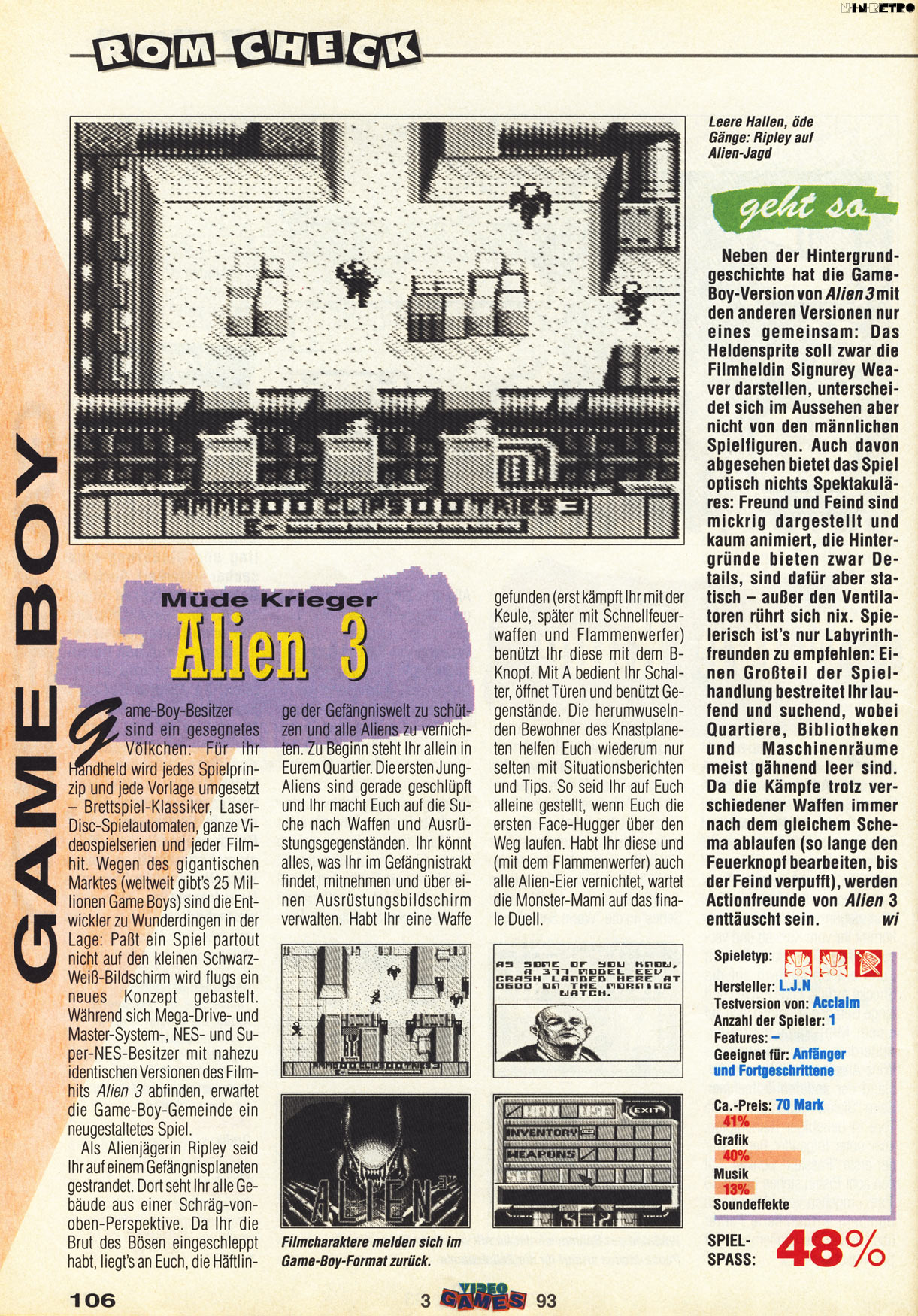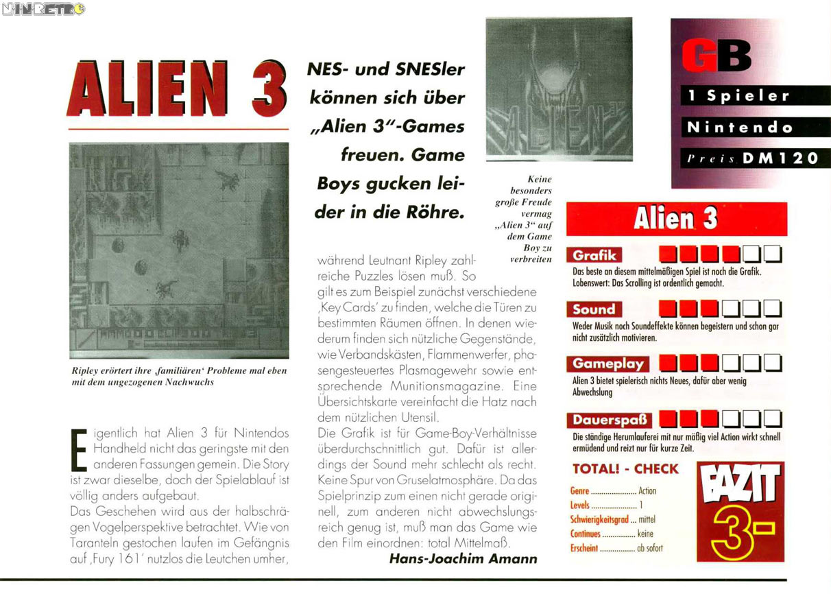 Ich hatte ALIEN 3 für den Game Boy und hab es damals auch erfolgreich durchgespielt.