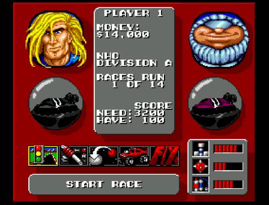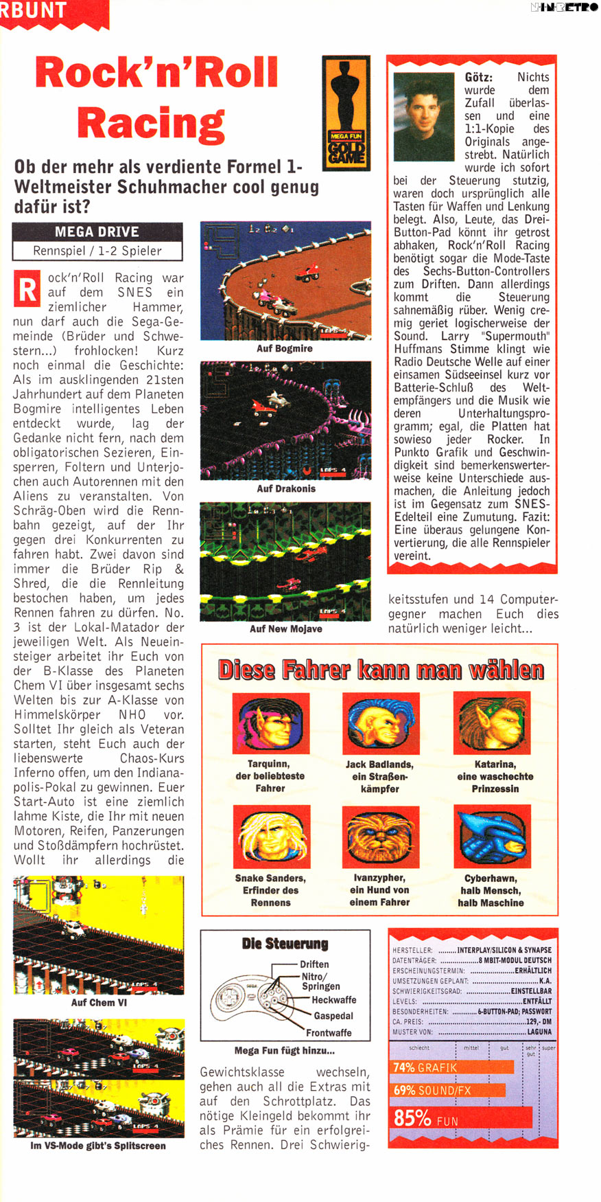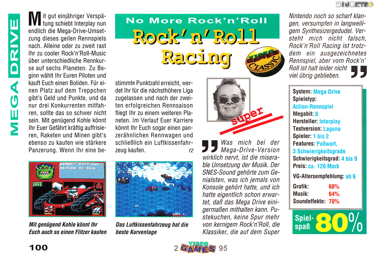 Der Sound ist - für sich gesehen - eigentlich doch ganz ok, was allerdings nervt ist die im Vergleich zum SNES tierisch beschissene Tastenbelegung (selbst mit 6-Button-Controller). Ich wünschte man könnte sie ändern, hab aber auch keine Anleitung zum Modul. Rock 'n Roll Racing ist leider komplett auf dem MD auch nicht ganz billig zu kriegen.