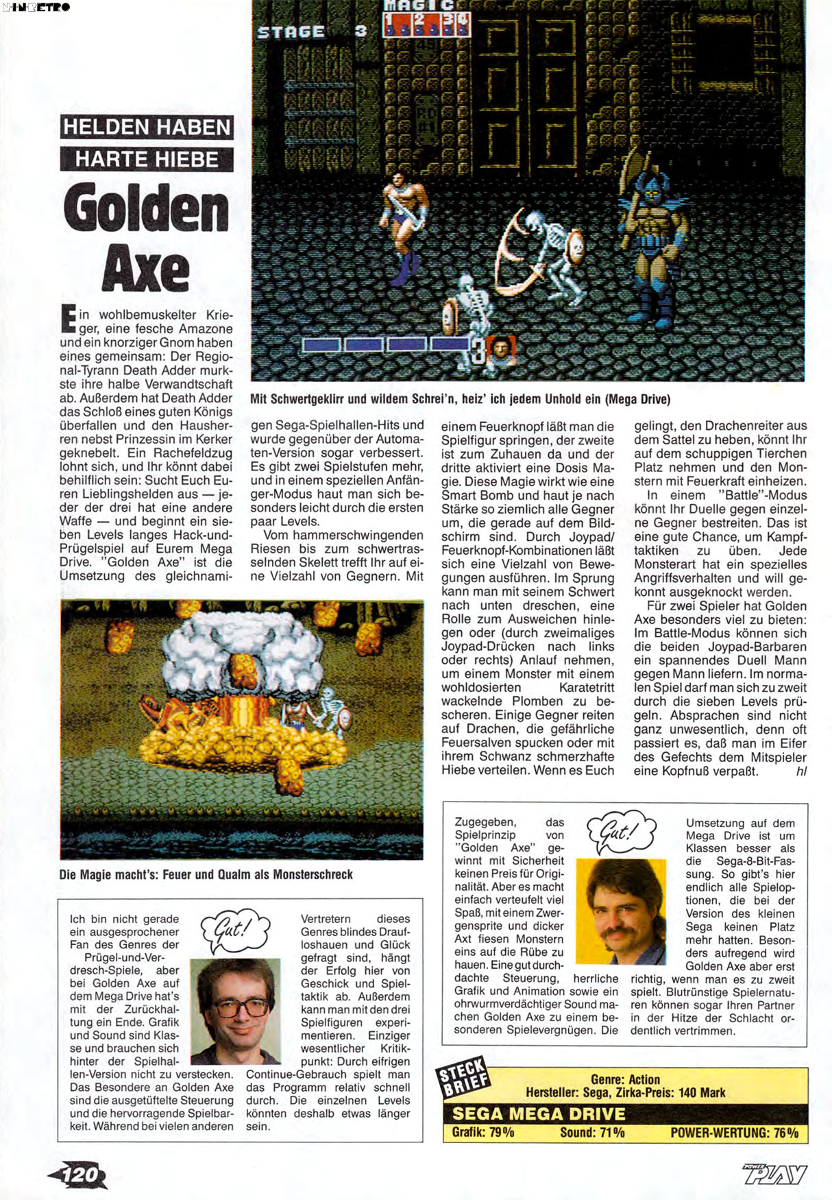 Ich habe das Spiel 1990 zum ersten Mal in einer Spielhalle im Urlaub gespielt! Als ich es dann einige Zeit später im Laden auf einem Fernseher sah konnte ich meinen Augen kaum trauen! Der Preis von damals glaub ich DM600 für den Mega Drive plus DM130 für Golden Axe waren dann aber doch etwas zu viel für meinen schmalen Schüler Geldbeutel.