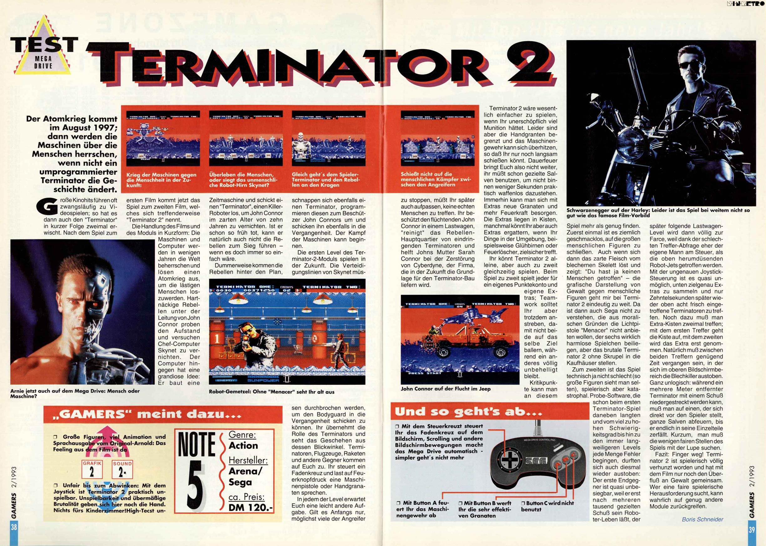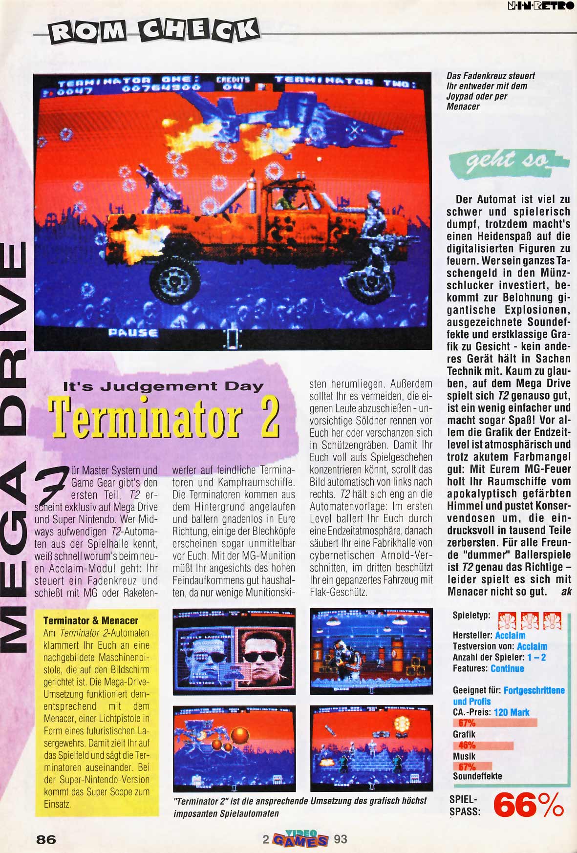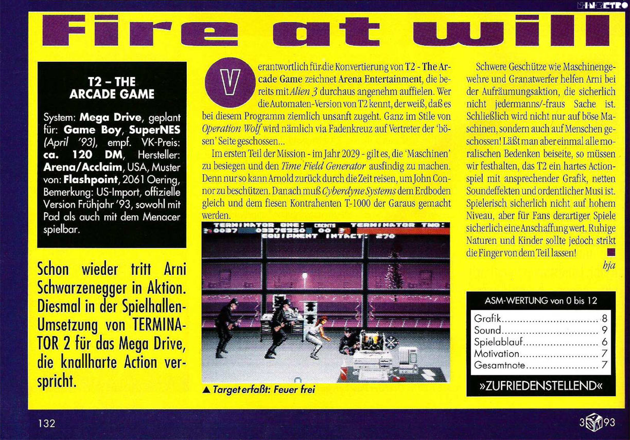 The #1 arcade shooting game of all time explodes onto Megadrive. You're a T800 terminator with an awesome array of weapons: rapid fire machine gung, shotgun, rockets and an M-79 grenade launcher. Blast andoskeletons and HKs... terminate the liquid metal T-1000 or be TERMINATED.