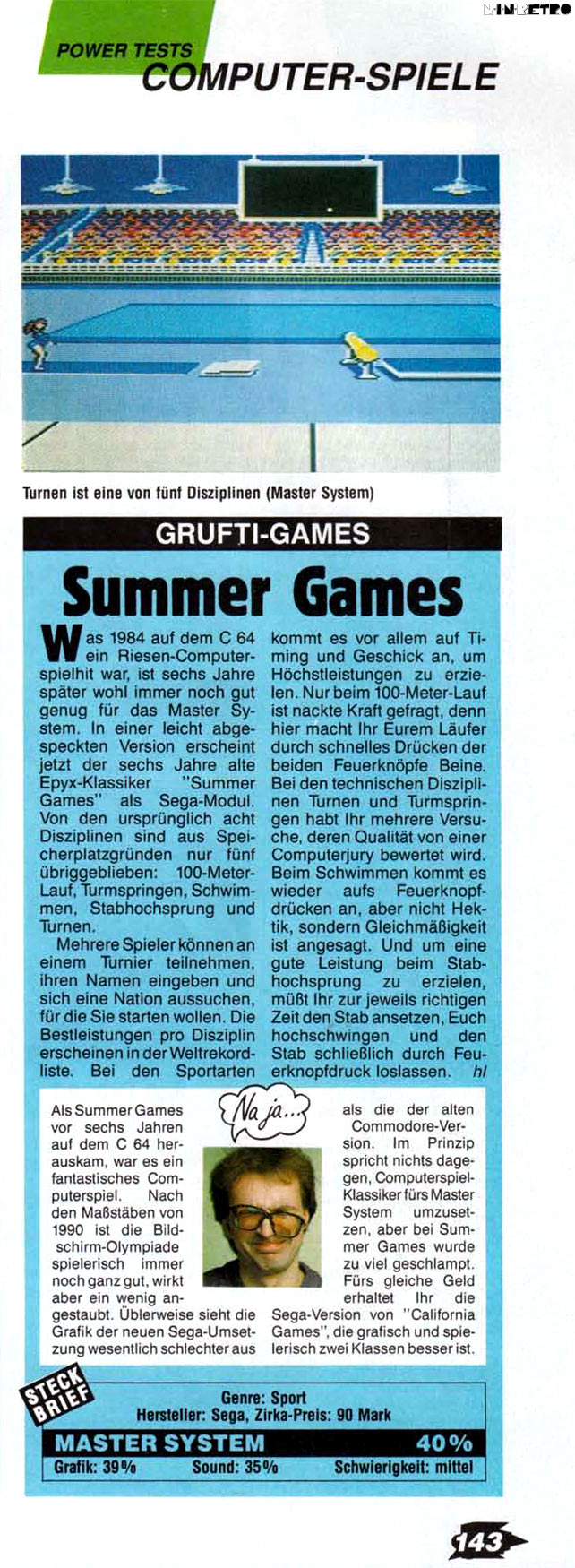 "Summer Games" ohne Tontaubenschießen? Immerhin gibt's hier noch eine Disziplin mehr als bei "World Games" auf dem Master System.