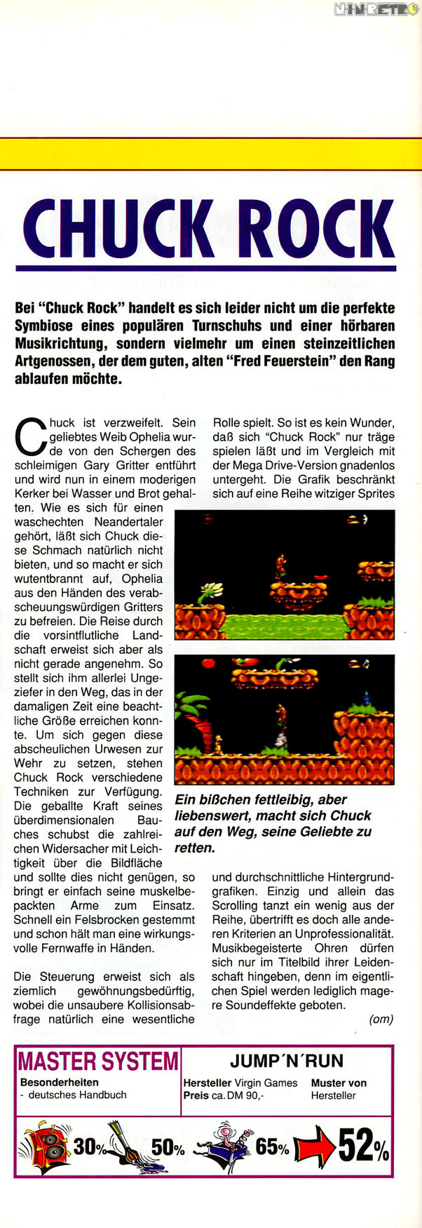 Unga Bunga! Chuck Rock's wife, Ophelia, has been captured by the no-good Gary Gritter. Can Chuck belly-butt his way through five incresingly challenging stages, each one packed with dozens of derariged dinosaurs and surprises galore? Or is his love destined to end up on the rocks?
