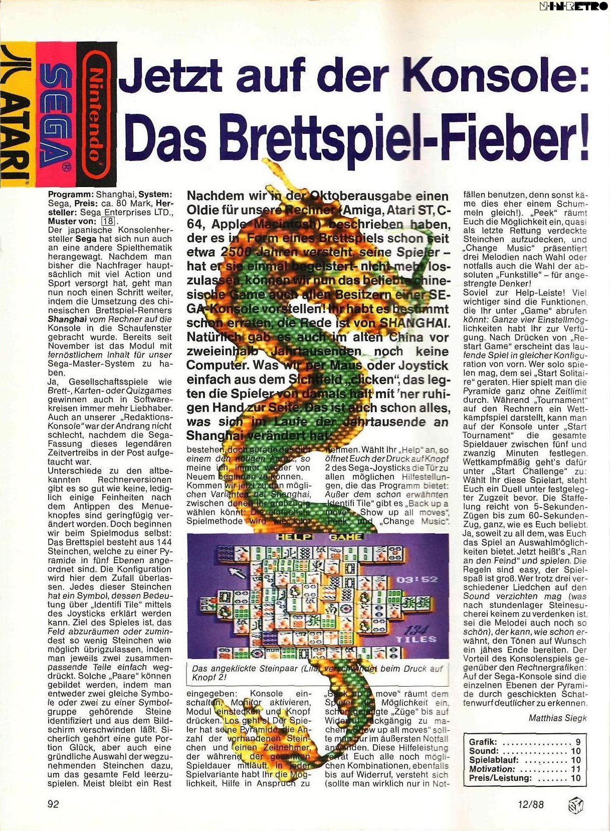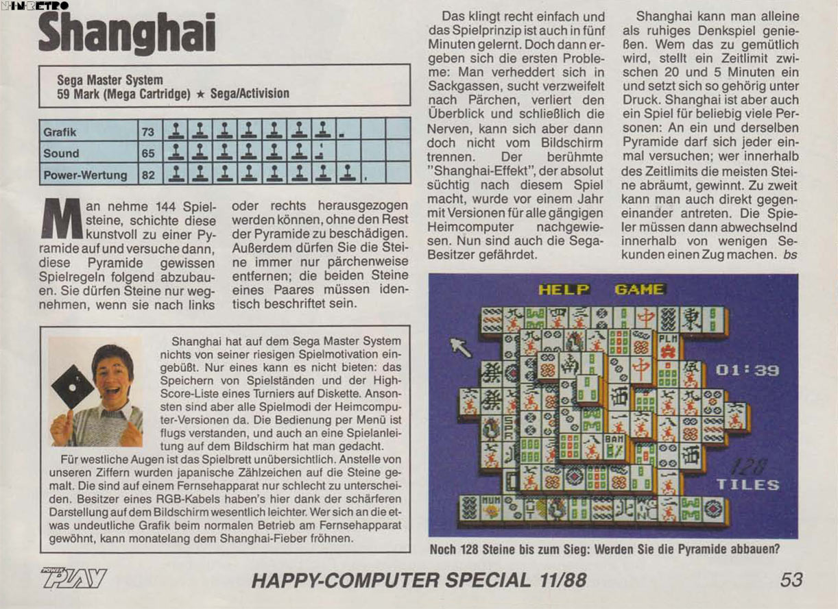 Wie man sieht, ist eine vernünftige 8-Bit-Umsetzung machbar - beim C64-Shanghai konnte man ja die Spielsteine kaum erkennen. Mittlerweile gibt es so viele gute Mahjong-Spiele (u.A. auch für Playstation 1), dass sich die Anschaffung der Sega-Version eigentlich nicht mehr lohnt - für damalige Verhältnisse war's aber eine super-Umsetzung!
