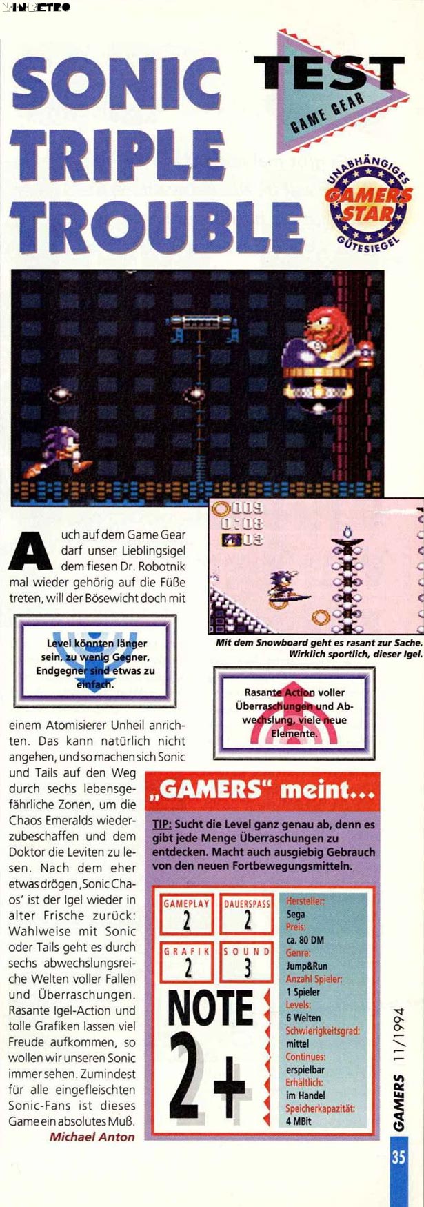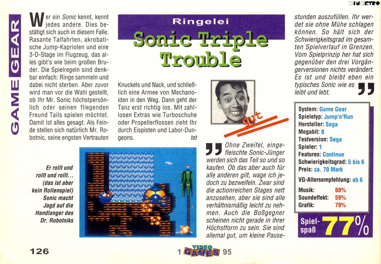 Der Fluch der späten Spiele. 1995 müsste doch auch schon eher die End-Ära des Game Gears gewesen sein, zumindest in Europa. Kam bei mir aber auch öfter bei Konsolen/Handhelds vor, dass ich am Ende ein paar "Perlen" gar nicht mehr mitbekommen habe. Entweder weil ich schon das Nachfolgesystem hatte, oder entgegenfieberte, oder aber die jeweiligen Spiele gar nicht mehr großartig beworben wurden oder bei uns erschienen sind. Spontan fällt mir da z.B. Mega Man 5 ein. Kann mich jetzt spontan nicht erinnern, dass das in einer Zeitschrift die ich habe getestet wurde und Mega Man 6 schaffte es ja nicht mal mehr nach Europa. Aber sieht man ja auch bei Sonic Triple Trouble, wird mit einem halbseitigen Testbericht kurz abgehandelt, 2 bis 3 Jahre früher hätte es wohl min. einen 1-Seiten-Test, wenn nicht sogar einen Doppelseiten-Test bekommen. Ob es zu dem Titel von Seiten Segas Printwerbung gab, weiß ich allerdings nicht, kann mich zumindest nicht daran erinnern.