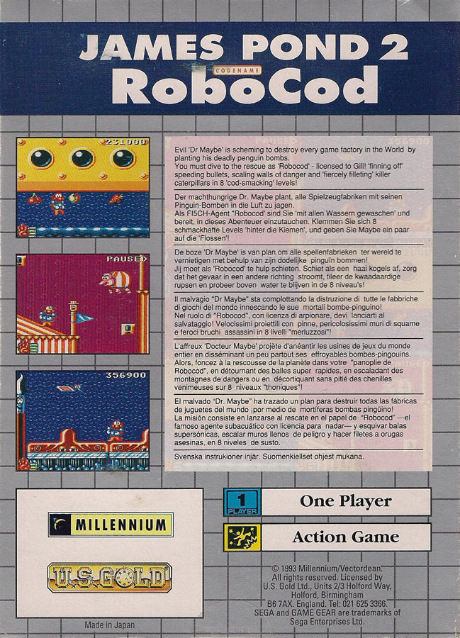 You must dive to the rescue as "Robocod" - licensed to Gill "finning off" speeding bullets, scaling walls of danger and "fiercely filleting" killer caterpillars in 8 "cod-smacking" levels!