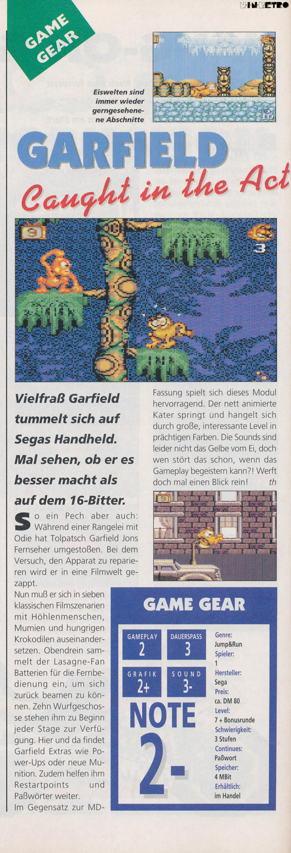 Willkommen in der kunterbunten Welt Garfields und seiner Freunde! In diesem allersten 8 MBit-Spiel für das SEGA GAME GEAR erleben Sie aufregende Abenteuer und filmreife Kapriolen voller Action und Humor mit dem coolsten Kater der Comicgeschichte. Garfield bestreitet sein erstes Spiel als Fernseh- und Videostar. Begleiten Sie ihn in schönsten Technicolor durch Hunderte großer Abschnitte und genießen Sie das größten GAME GEAR-Spiel, das es je gab!