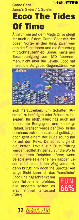 Der böse Vortex ist zurück und Ecco muß erneut ein gefährliches Abenteuer bestehen. Führen Sie Ecco mit Hilfe des schönen Trellia durch über 25 Level voller Unterwasser-Action und neuartige 3D-Level. Während Sie in gigantische, neue Welten vordringen, verwandelt sich Ecco in einen Hai, eine Qualle und sogar in eine Seemöve.