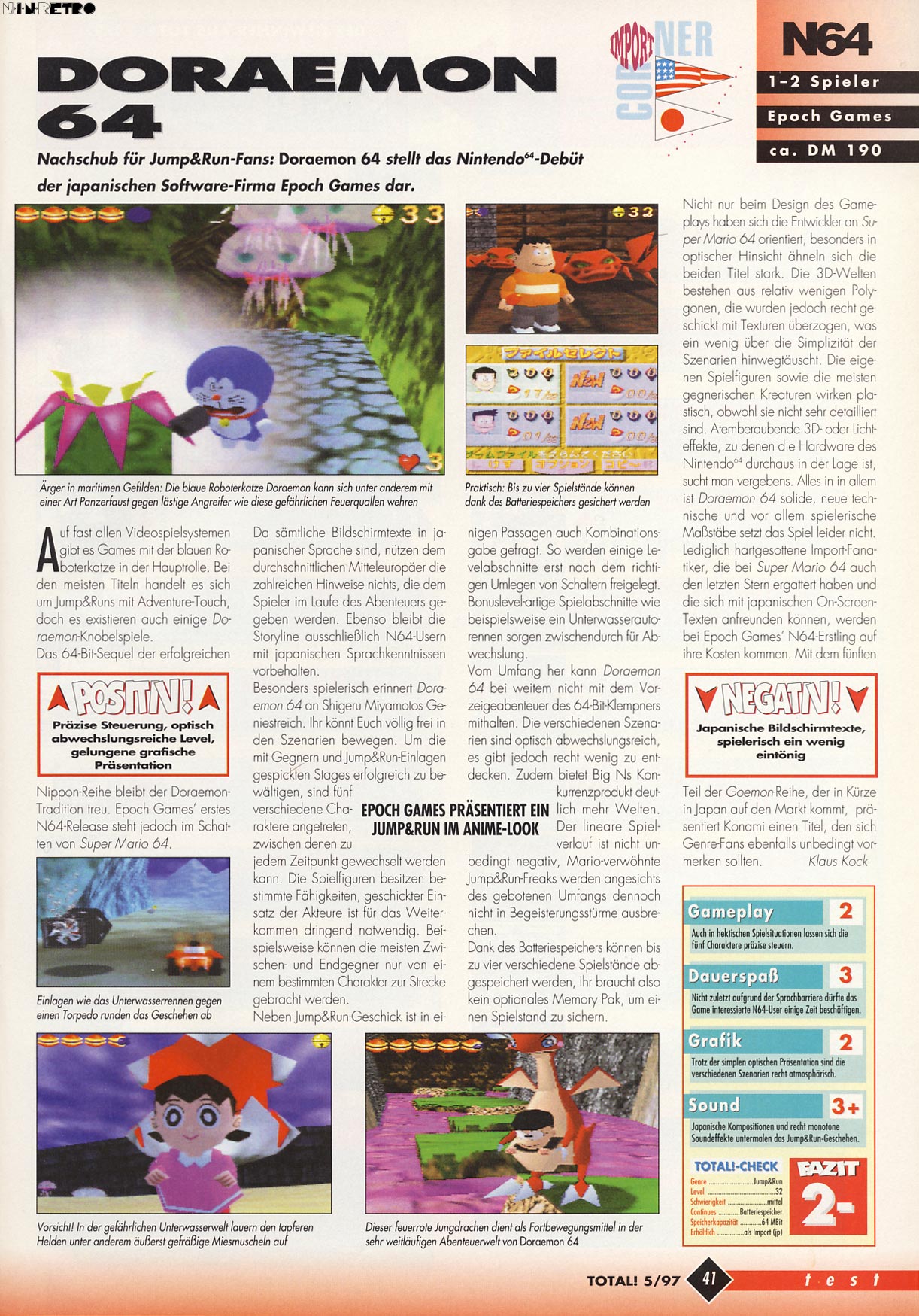Was ein merkwürdiges Spiel. Insgesamt sind davon 3 Teile auf dem N64 erschienen. Von der Optik her sind alle identisch. Ich kann damit nichts anfangen. Die Sprache ist, besonders da es ein Jump´n Run ist, gar nicht so das Problem. Aber Optik und Sound sind einfach zu merkwürdig. Die Japaner hingegen müssen ja auf das Spiel regelrecht abfahren. Es gibt unzählige Teile auf mehreren Systemen davon. Wer von dem Titel noch nie etwas gehört hat, dem ist auch nicht wirklich viel entgangen. IMO unspektakuläre und unschöne Kost das Ganze!