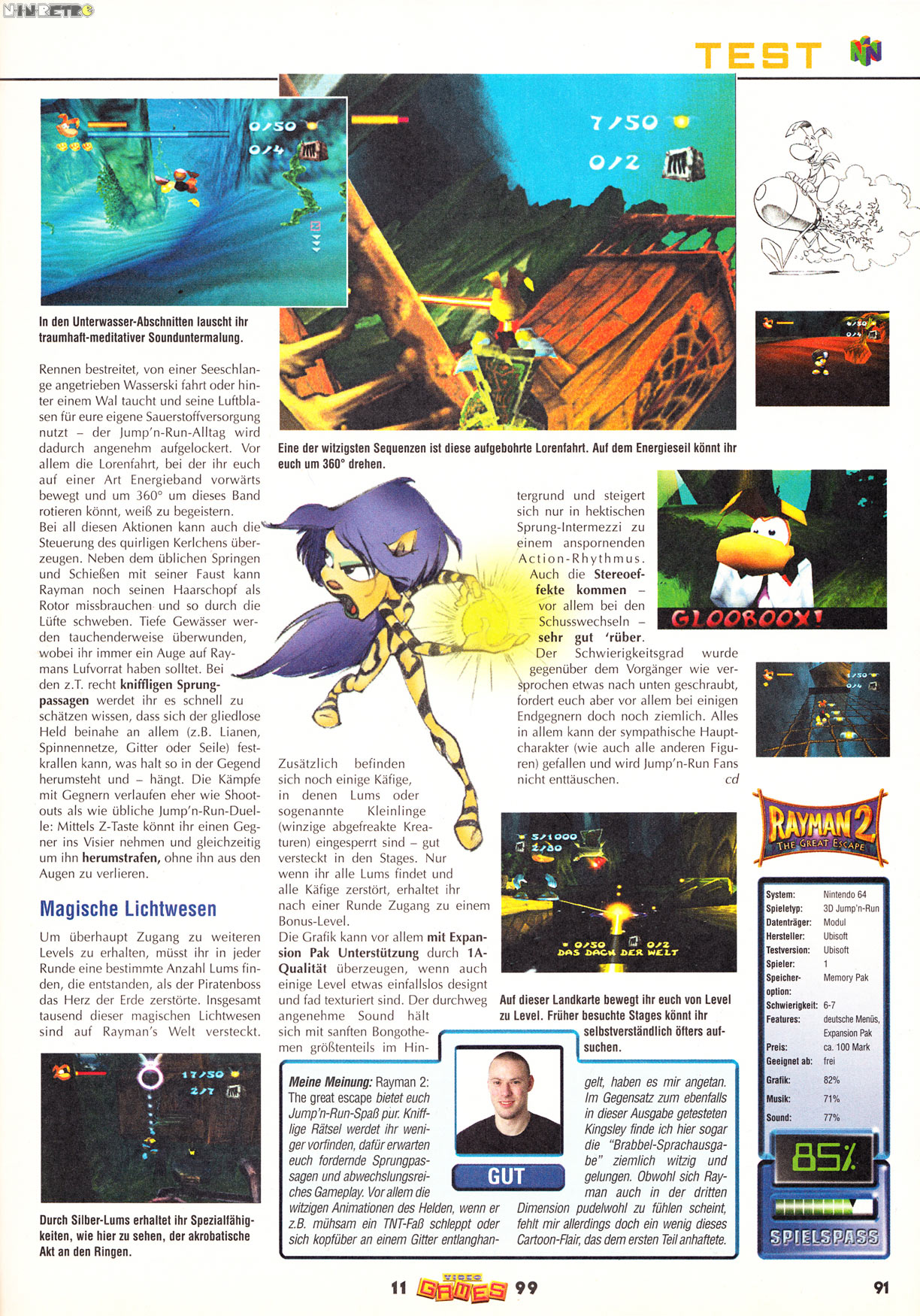 Die Rayman-Welt ist gut in Szene gesetzt und der Humor stimmt auch. Die Steuerung paßt und spielerisch gibt es nur wenig zu meckern. Aber dir Grafik und die Musik...oh oh oh. So ein N64-Modul hat natürlich einen begrenzten Speicherplatz, klar. Aber so grobe Texturen sind wirklich Augenfeindlich. Schlimm. Da hat man viel schönere Texturen auf dem SNES gehabt. Aber das ist ja das bekannte N64-Problem gewesen. Hauptsache 3D-Umgebung. Auf der Playstation sah Rayman viel besser aus. Nichtsdestotrotz macht es auch auf dem N64 mit dem kleinen (h)armlosen Protagonisten Spaß. Und darauf kommt es bekanntlich an.