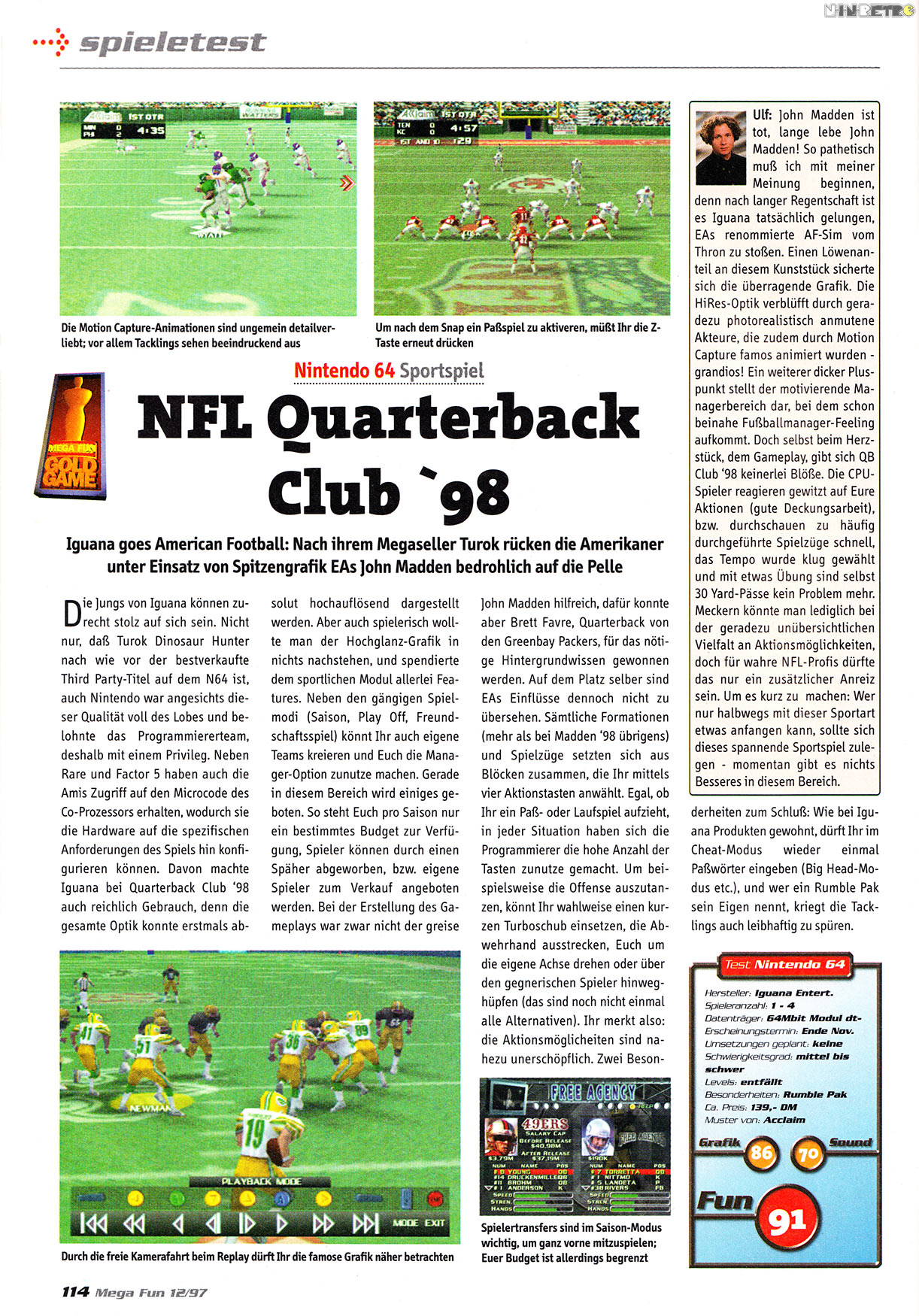 DAS EINZIGE OFFIZIELLE NFL-SPIEL DER SAISON 97/98 FÜR N64! ALLE 30 NFL-TEAMS UND ÜBER 1.500 SPIELER SIND BEI DIESEM ALLERERSTEN KONSOLENSPIEL MIT HOCHAUFLÖSENDEN 640X480-GRAFIKEN DABEI. SPÜREN SIE DIE POWER DES ECHTEN AMERICAN FOOTBALL MIT DEM NINTENDO 64 RUMBLE PAK! WEITERE FEATURES: MOTION-CAPTURING-ANIMATIONEN, KOMPLETTE STATISTIKAUFZEICHNUNGEN, TOTALES TEAM-MANAGEMENT UND SPIELZÜGE VON SUPERBOWL-QUARTERBACK BRETT FAVRE!