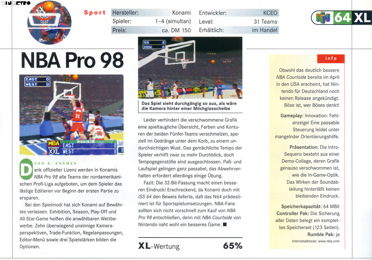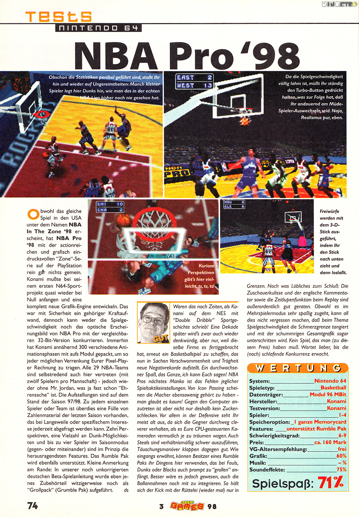 For the first time ever NBA In The Zone '98 jams it home on the N64! Feel every rim rockin' dunk with the RUMBLE PAK feature as you take your team through a full regular season and into the NBA Finals.