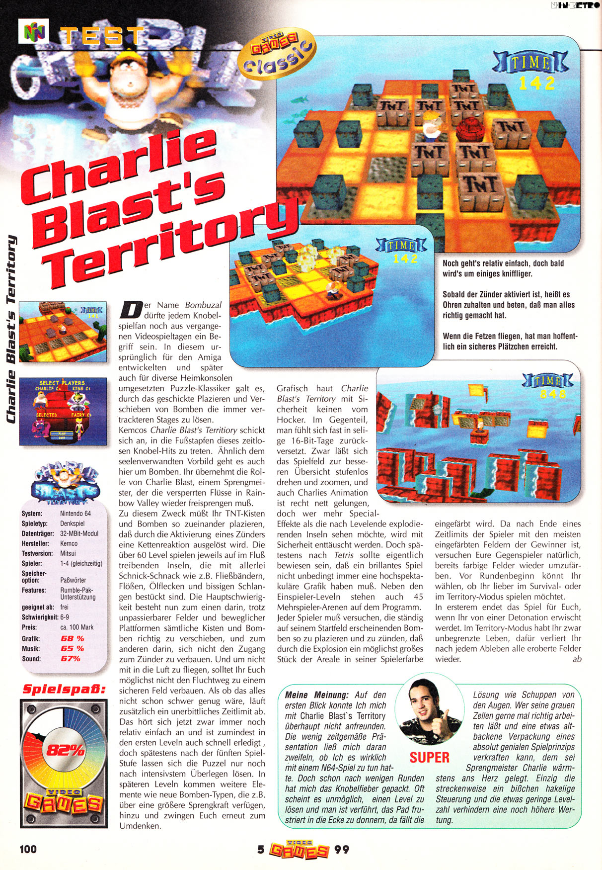 Here's a fun puzzle for you, Charlie. See if you can set up a series of bombs in time to blow yourself to the next level - before you get so nervous you explode. It's a total N64 blast for 1 to 4 players. Bursting with cool Line Bombs and Freeze Bombs to demolish your competition. 45 increasingly complicated Multi Player game boards for Survival Mode and Territory Mode. 60 single player Puzzle Mode levels. All kinds of wacky booby-traps designed by the world-famous game designer Scott Kim. Plus: seamless 3-D animation, funky puzzle environments, high powered, high resolution graphics and megatons of immediate gratification. Put on your hard hat and light the fuse. You're in for a dyn-o-mighty good time.