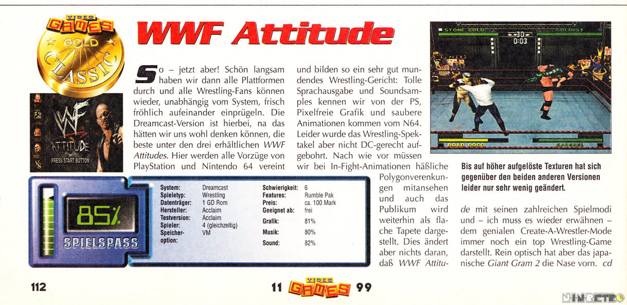 Habe es auf der Dreamcast geliebt und Ewigkeiten damit verbracht neue Wrestler zu erstellen. Man konnte ja auf jeder VMU ich glaube 10 Wrestler speichern! Bei 4 Pads und je 2 VMUs kam da ganz schön was zusammen!
